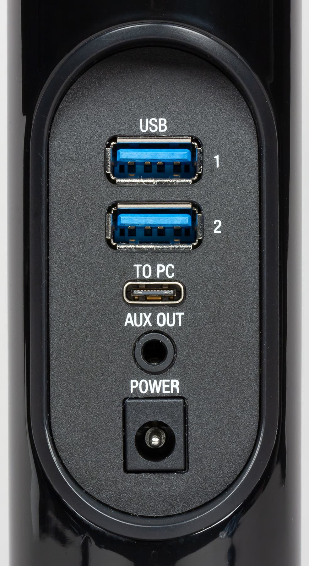 Чуть ниже панели управления, на задней части цилиндра, расположены: 2 порта USB 3.0, USB Type-C для подключения системы к ПК, выход 3,5 мм для подключения внешней акустической системы, разъем для подключения адаптера питания.