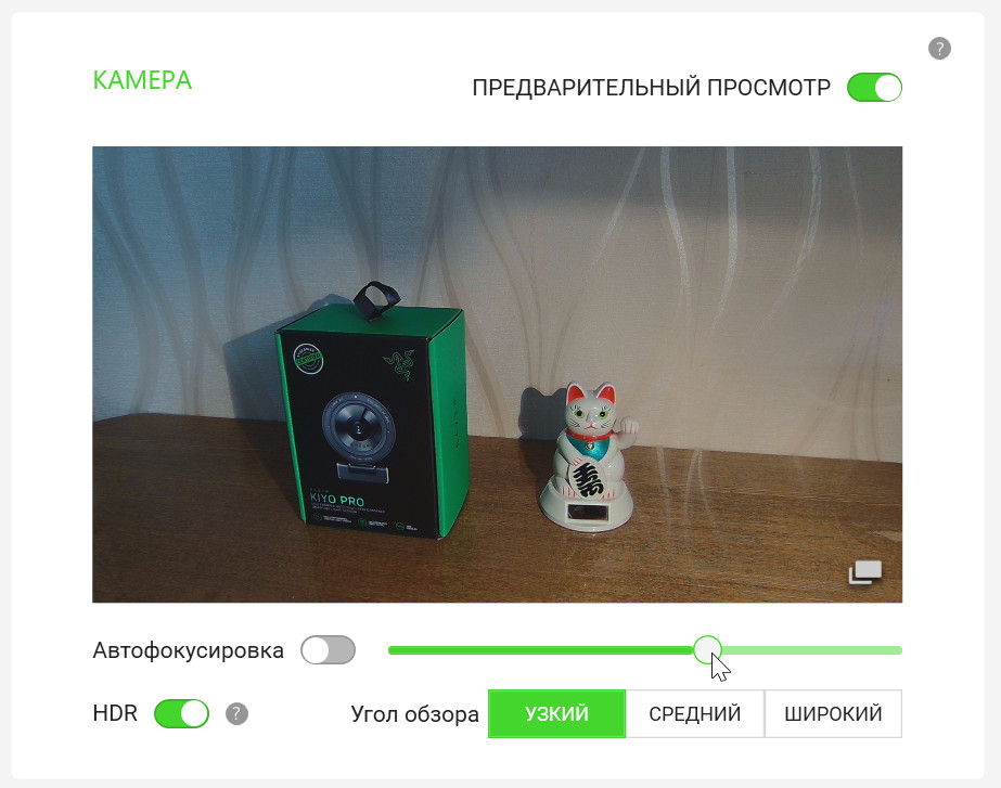 Угол обзора камеры меняется соответствующими переключателями (сразу скажем — разброс совсем незначительный), здесь же имеется переключатель, активирующий технологию HDR. Известно, что у каждого производителя имеется исключительно свое, собственное представление об этой технологии. Кто-то работает «по-честному», используя широкий динамический диапазон и кодируя материал в специальные цветовые профили и матрицы. А кто-то просто берет и программно корректирует экспозицию в разных участках кадра, снижая яркость в пересвеченных зонах, и, наоборот, увеличивая ее в недосвеченных. Именно так работает HDR в камере Razer Kiyo Pro.