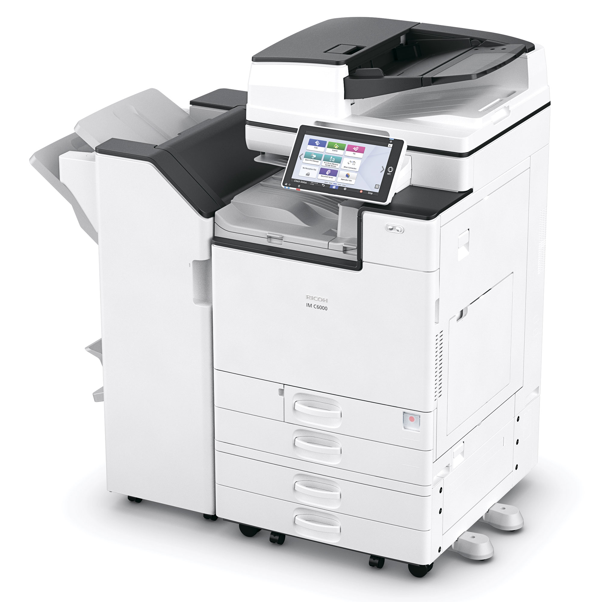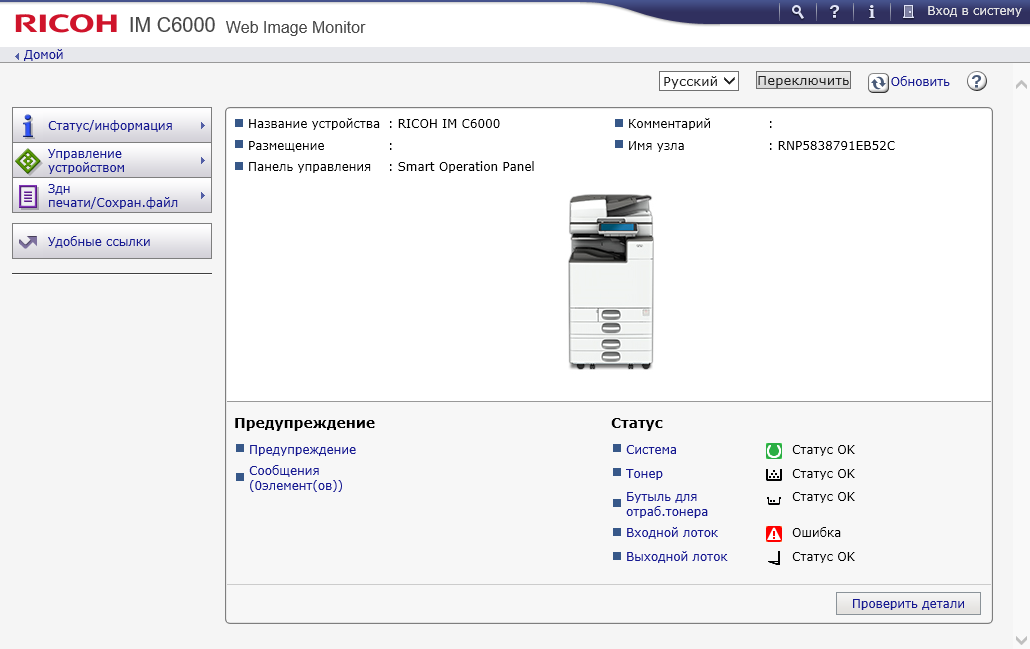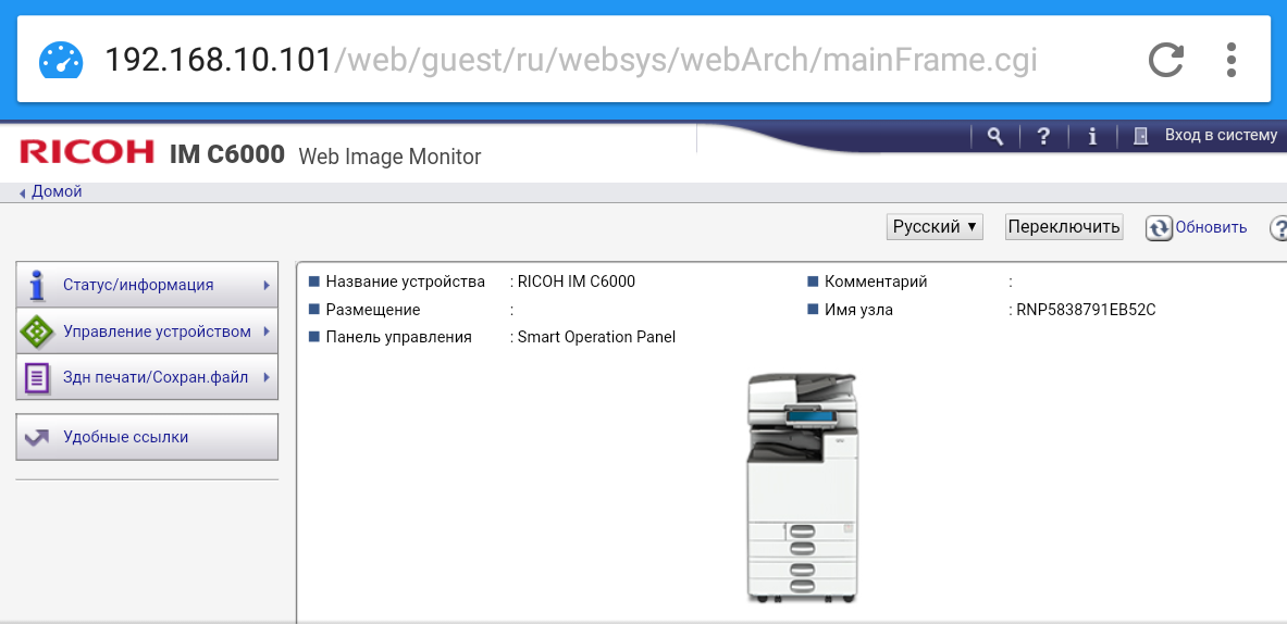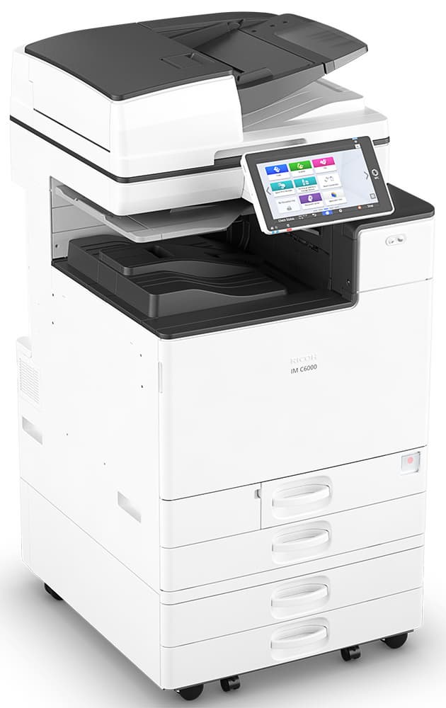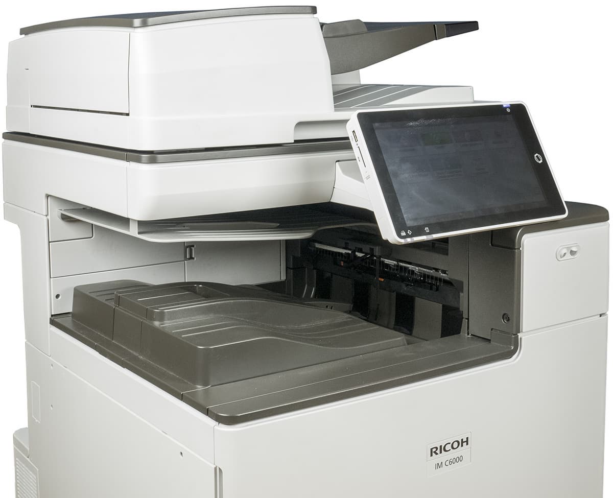 Мы рассмотрим многофункциональное устройство «4 в 1» Ricoh IM C6000, которое является старшим в линейке — первые две цифры в индексе модели как раз и говорят о производительности, в данном случае до 60 стр/мин.