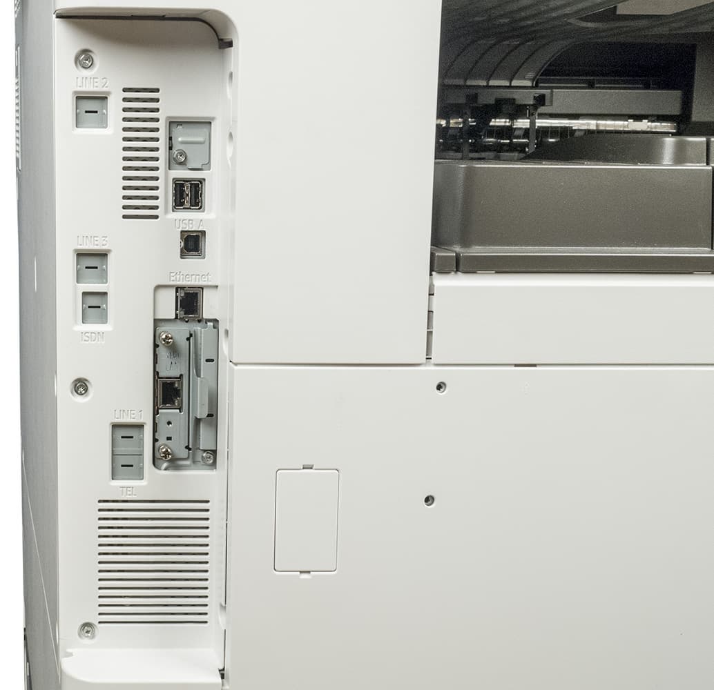 Аппарат в базовой поставке имеет три лотка, включая два выдвижных и обходной, цветной сенсорный ЖК-экран с диагональю 10,1″. Он оснащен двумя интерфейсами: локальным USB и сетевым Ethernet, а для работы в беспроводной сети можно приобрести опциональный адаптер Wi-Fi.