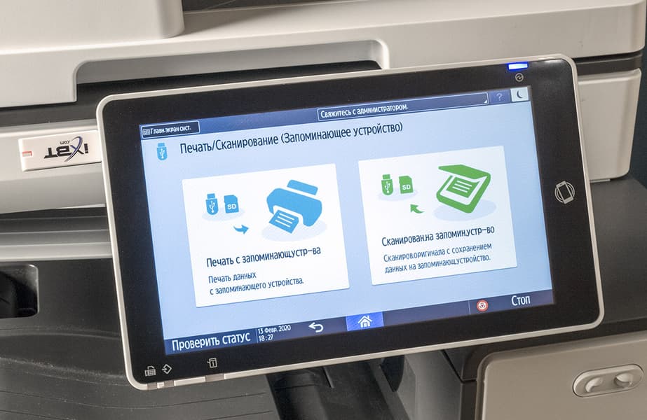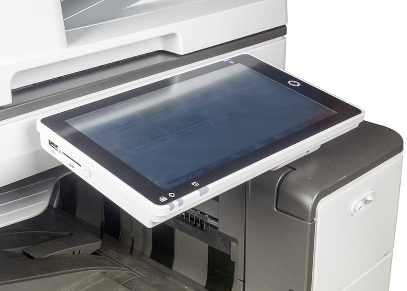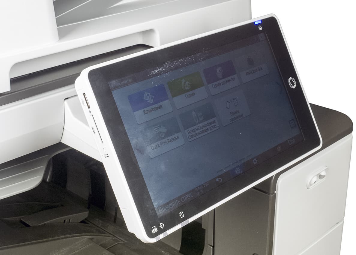 Спереди выделяется панель управления с очень большим цветным сенсорным ЖК-экраном, диагональ которого составляет без малого 26 см (10,1″). Панель закреплена на шарнире, позволяющем поворачивать ее из почти горизонтального положения на угол до 45 градусов. Этого вполне достаточно для удобной работы с МФУ, даже оснащенного дополнительными лотками или установленного на опциональную тумбу, при любом положении оператора — стоя или сидя.