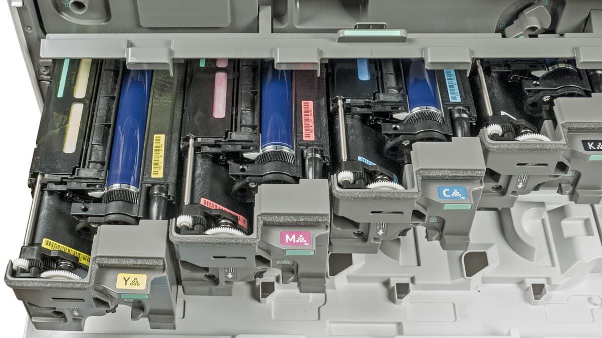 Прежде всего, это тонер-картриджи четырех цветов. Они предлагаются в единственном варианте: черный с ресурсом 33 000 отпечатков и три цветных на 22 500 страниц. Каких-то разновидностей с повышенной/пониженной емкостью или стартовых не имеется.