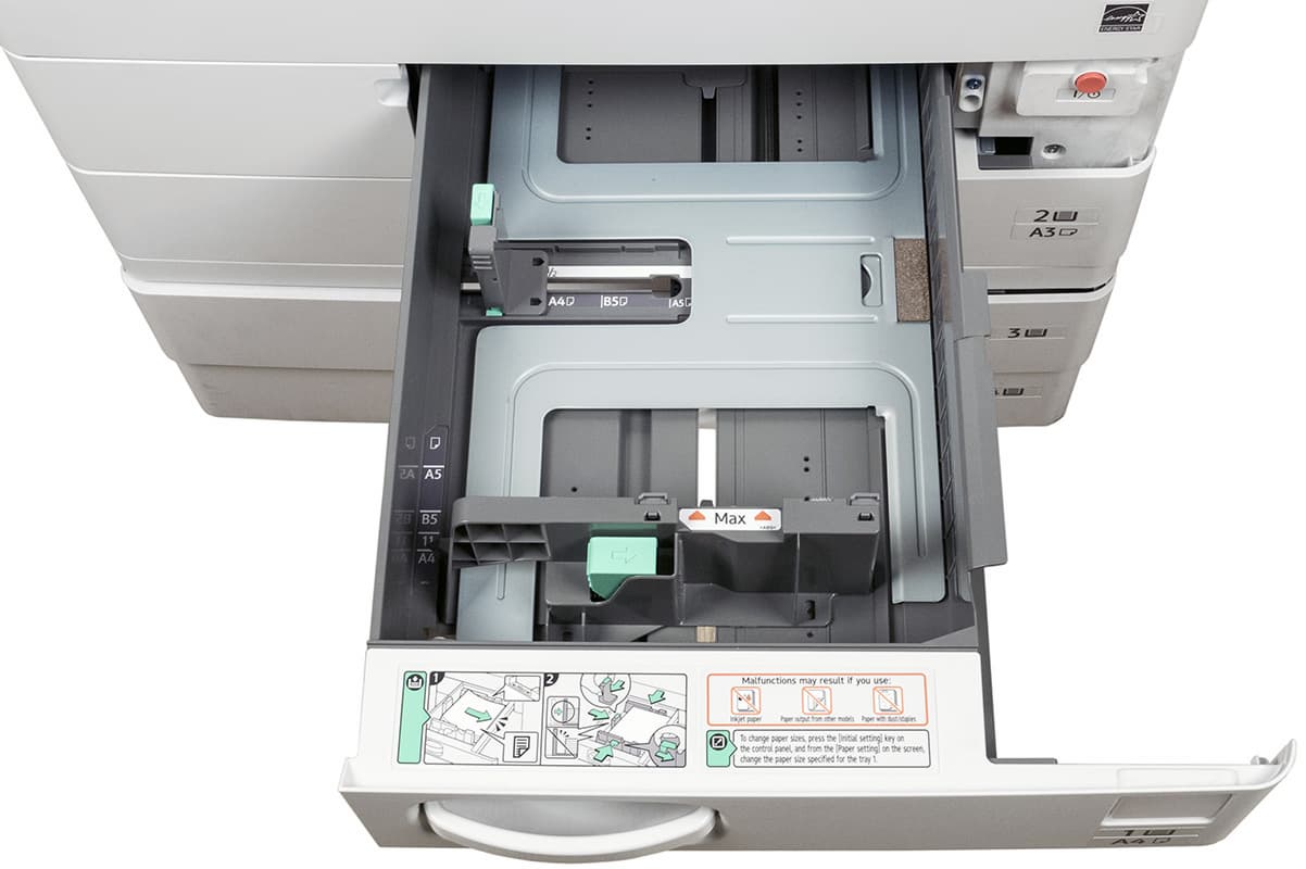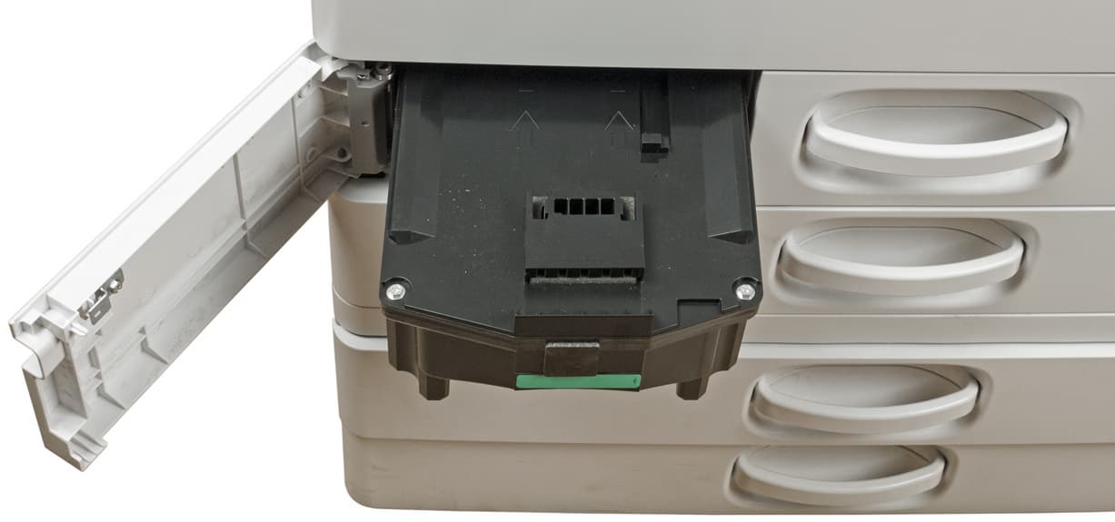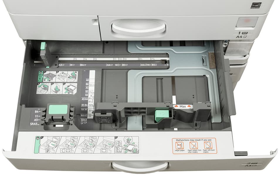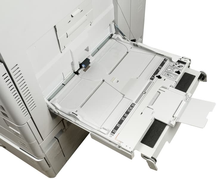 Штатных подающих лотков три. Два выдвижных находятся в нижней части базового блока, они вмещают по 550 листов. Таким образом, в каждый из них можно положить полную пачку бумаги, даже если ее плотность несколько выше обычных 80 г/м². Отличаются лотки предельным форматом: первый (верхний) до А4, второй (нижний) до А3/SRA3.
