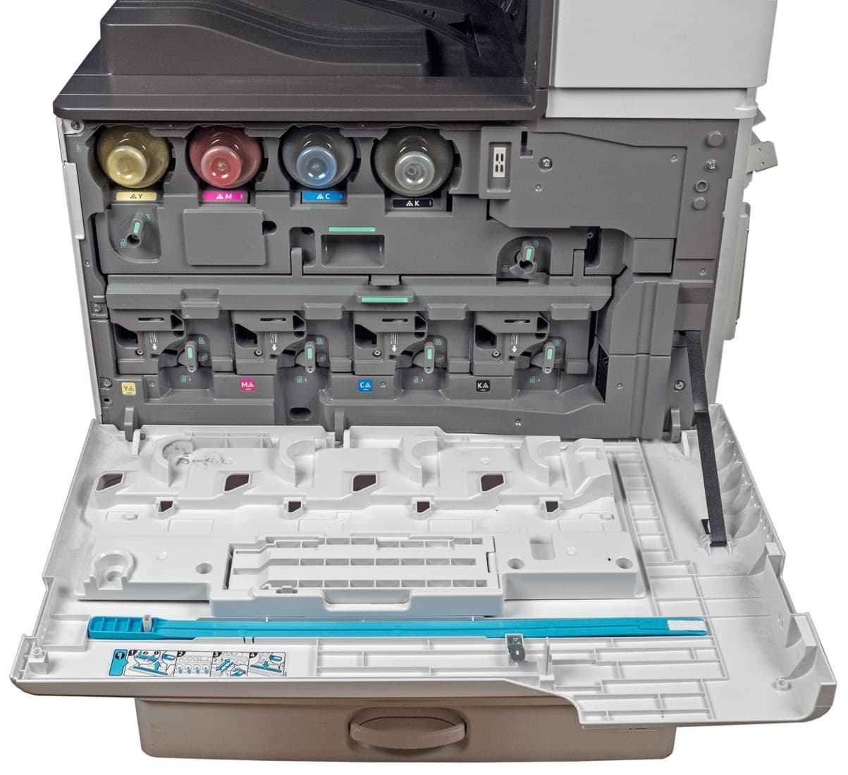Кроме того, есть совмещенные блоки фотобарабана и проявки — черный (на 400 тысяч отпечатков) и цветные (на 270 тысяч, отдельно для каждого из цветов CMY), а также блок термозакрепления (или фьюзер, на 300 тысяч). В инструкции о них не говорится, но в компании нас заверили, что все эти блоки может заменять сам пользователь — если, конечно, чувствует себя достаточно подготовленным для этого.