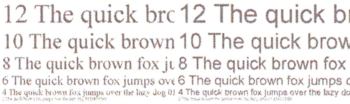 Повышение разрешения печати до 1200×1200 dpi эффект дает, но разница видна в основном с лупой: улучшается читаемость самых малых кеглей — так, 2-й кегль с засечками при этом становится уверенно различимым (если, конечно, у читающего достаточно хорошее зрение, чтобы видеть такую «мелочь»).