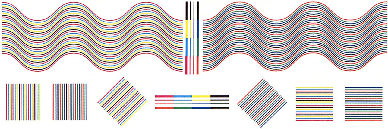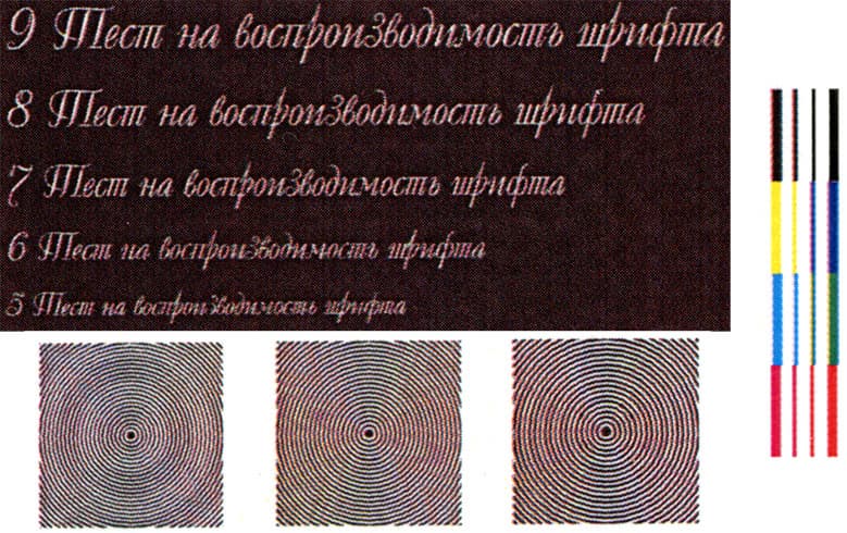 Ни одна из этих процедур теоретически не должна влиять на распечатку образцов, рассматриваемых нами в данный момент. Но ведь при настройке параметров печати можно забыть переключиться с цветного на черно-белый режим, и тогда возможны не самые приятные варианты. Вот пример распечатки в цветном режиме до корректировки регистрации: