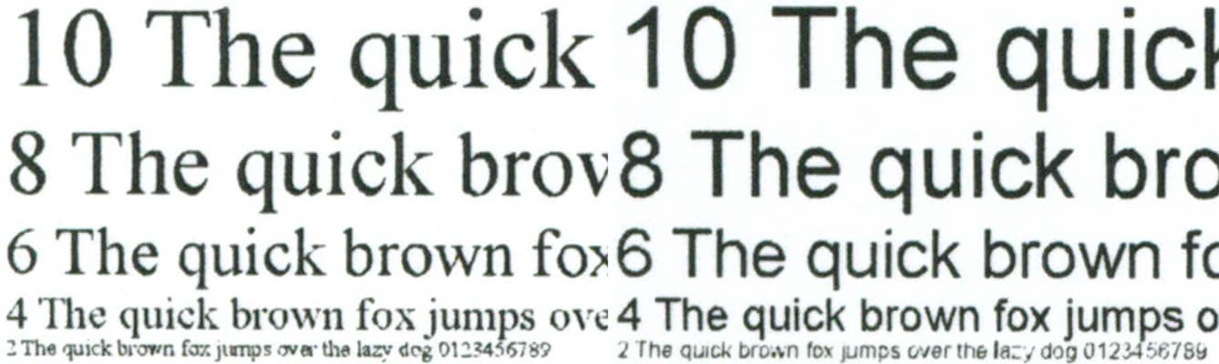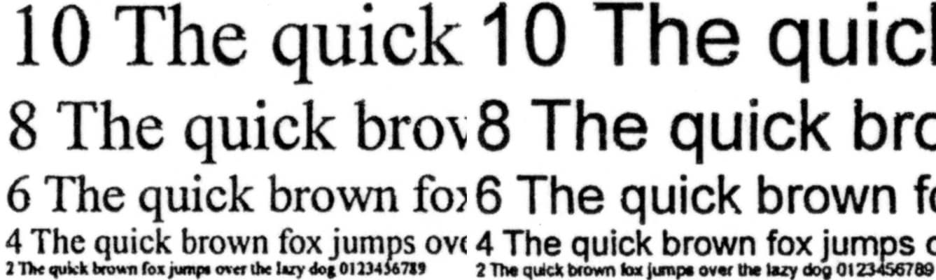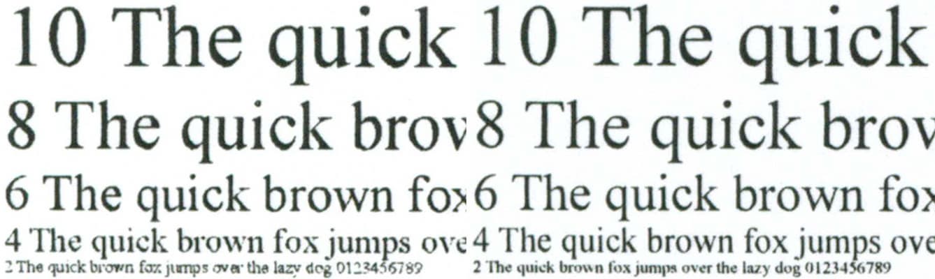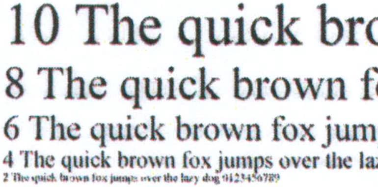 Копии, сделанные с отпечатка, на котором отчетливо читаются шрифты 2-го кегля, получаются очень качественными: 2-й кегль можно назвать условно читаемым, а 4-й хорошо читается для любого шрифта. Плотность заливки великовата, но это можно поправить соответствующей регулировкой или сменой типа оригинала, причем вполне вероятно, что 2-й кегль станет читаться немного лучше.