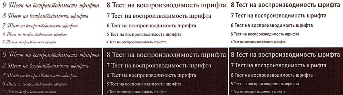 На текстовых полях при печати нормальной и вывороткой шрифты с засечками и без читаются от 4-го кегля, декоративный шрифт реально читается с кеглем от 5-го нормальный и от 6-го вывороткой.