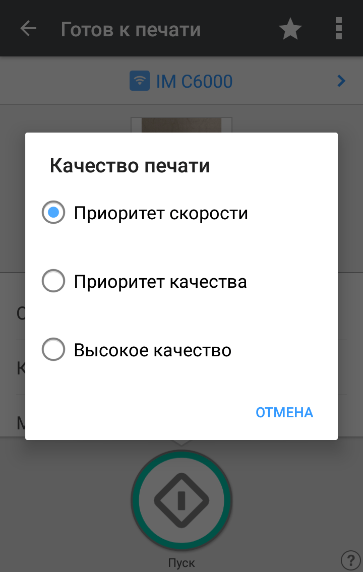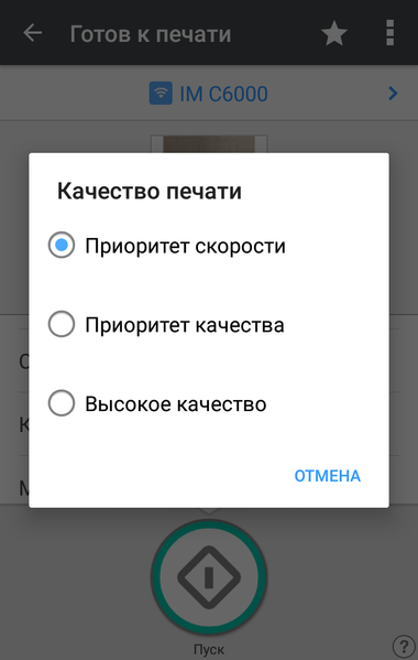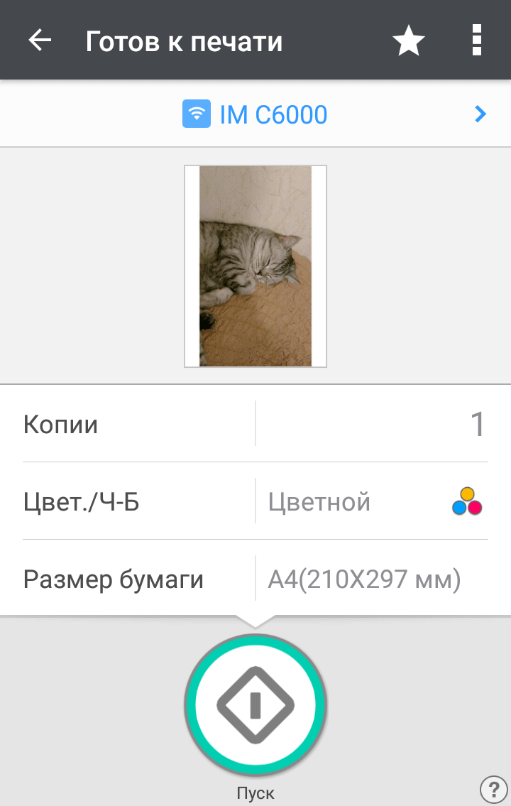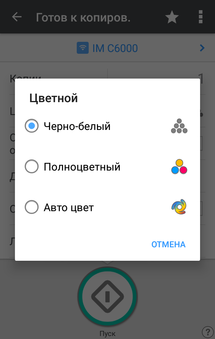 Запуск процедуры копирования осуществляется большой круглой кнопкой «Пуск» в правом нижнем углу экрана. Над ней имеется кнопка поменьше с надписью «Пробная копия», которая становится активной при изготовлении нескольких копий с сортировкой.