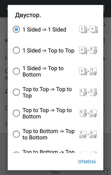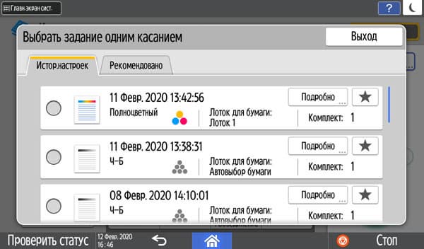 Слева есть закладка для выбора набора настроек одним касанием, причем двумя способами: либо по какой-то из ранее проделанных операций копирования, либо из предлагаемого списка стандартных наборов.