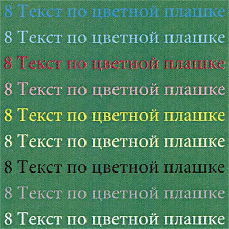 Цветной текст на зеленой плашке выглядит очень неплохо, включая даже синий шрифт, который обычно бывает различимым хуже других.