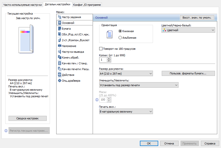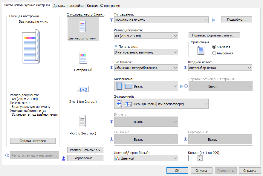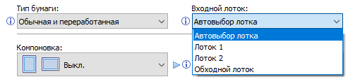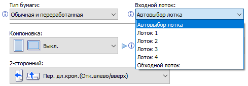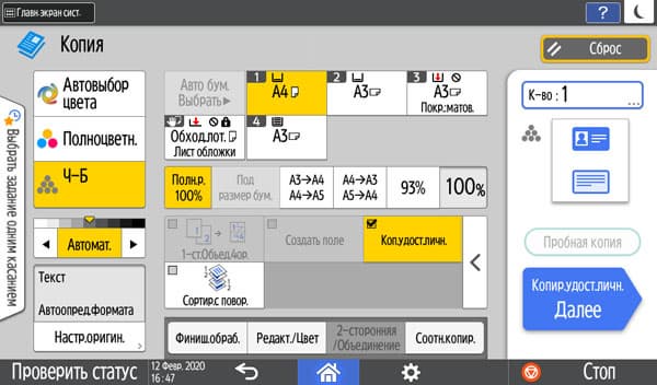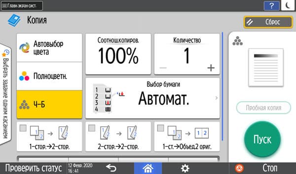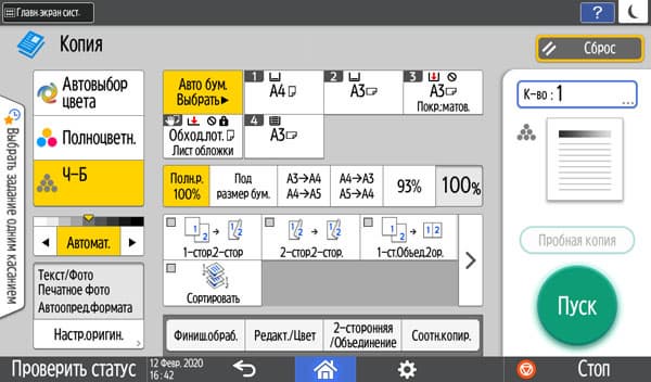 Оперативно выбираются: лоток (и соответственно носитель, на котором будет изготовлена копия), цветность (ч/б, полноцвет или автовыбор), масштаб, одно- или двусторонний режим, объединение двух односторонних оригиналов на одной копии.