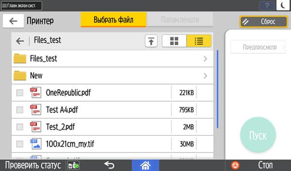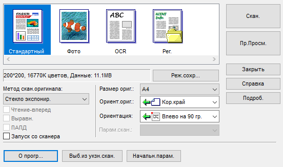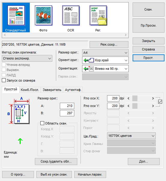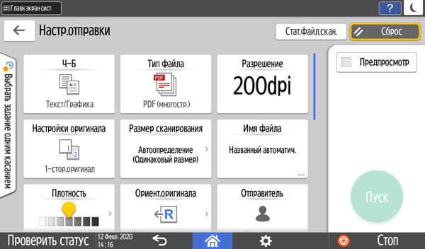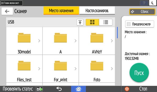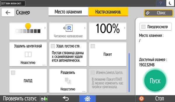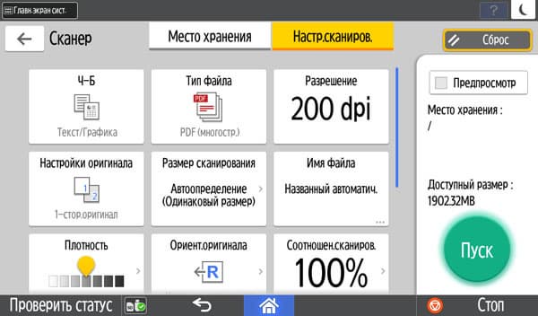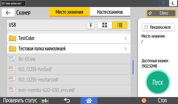 Для работы с USB-флешек задавалось сохранение в виде многостраничного PDF-файла, время замерялось от нажатия кнопки «Пуск» до окончания записи файла, при сканировании с компьютера — от старта кнопкой приложения до появления последней страницы в его окне. Поскольку установки «Тип оригинала», как на панели управления МФУ, в драйвере нет, использовались наиболее близкие параметры, они указаны в скобках. Напомним: для данного МФУ есть только сетевые драйверы сканирования, поэтому вариант с USB-подключением не тестировался.