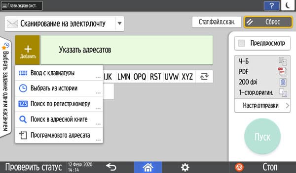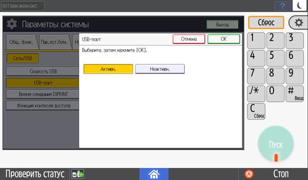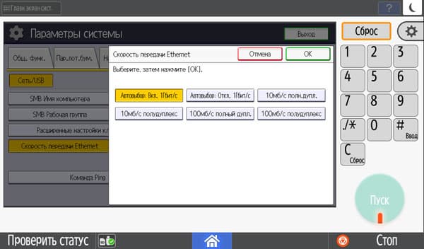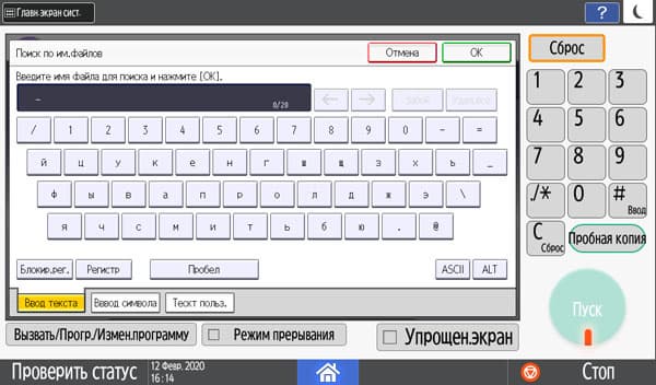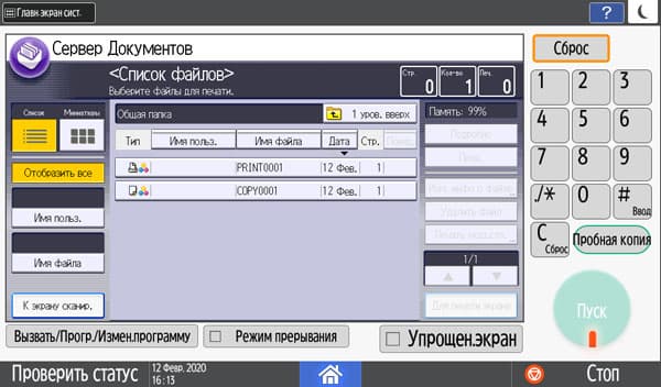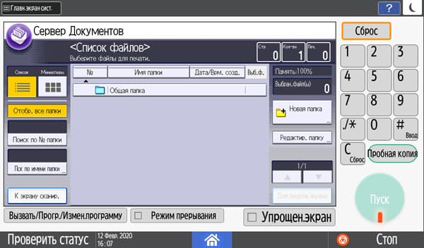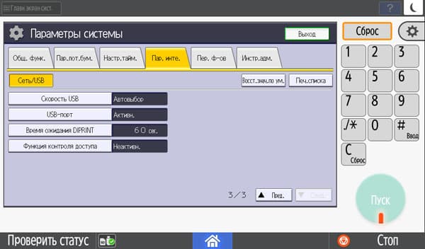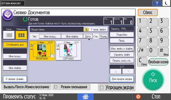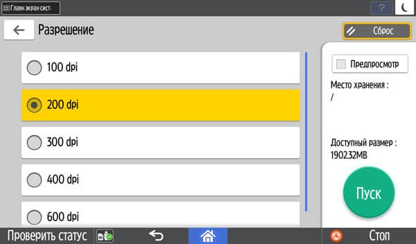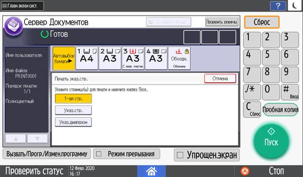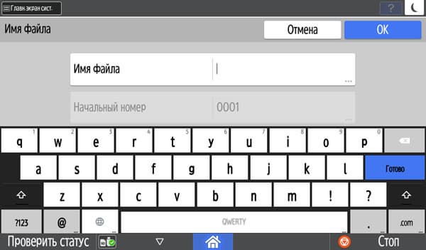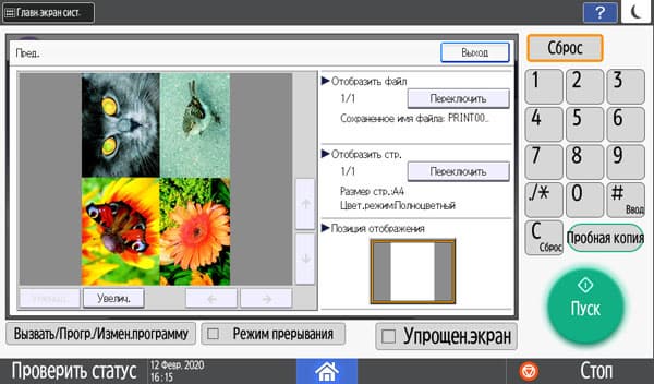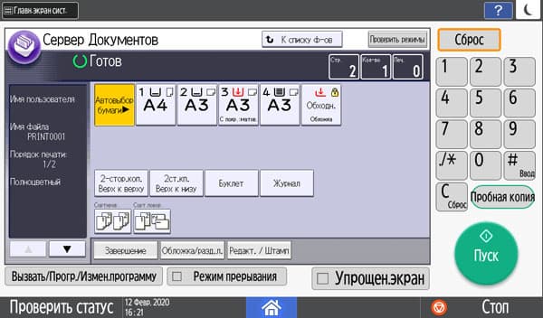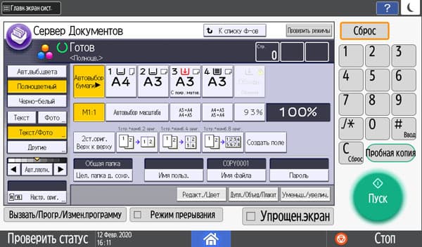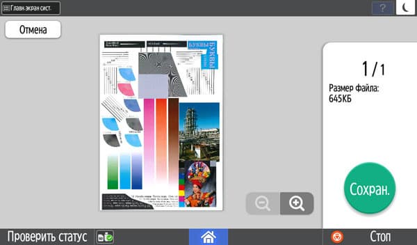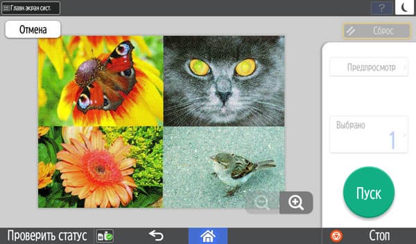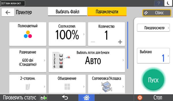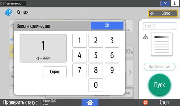 Количество копий отображается в правом верхнем углу и задается либо кнопочками «+» и «−», либо с появляющейся на экране цифровой клавиатуры. Максимальное задаваемое количество копий равно 999, в данном случае оно вполне соответствует возможностям подающих лотков, даже только штатных, но все же превосходит вместимость приемного лотка в том числе и в случае, когда документ имеет всего одну страницу. Однако подходов для извлечения изготовленных копий будет заметно меньше, чем у очень многих других принтеров и МФУ с тем же значением максимума, но гораздо менее вместительными приемными лотками.