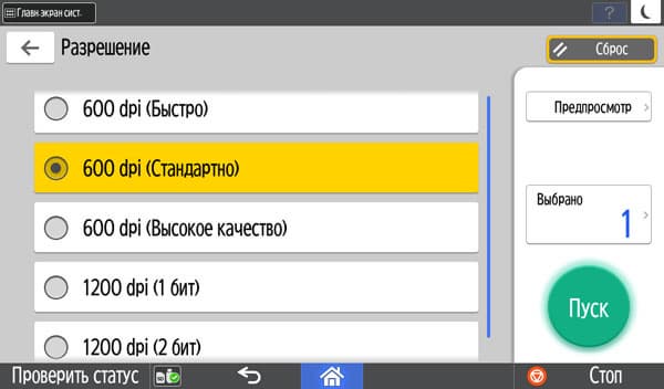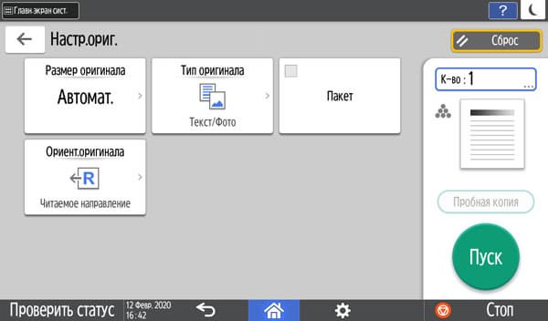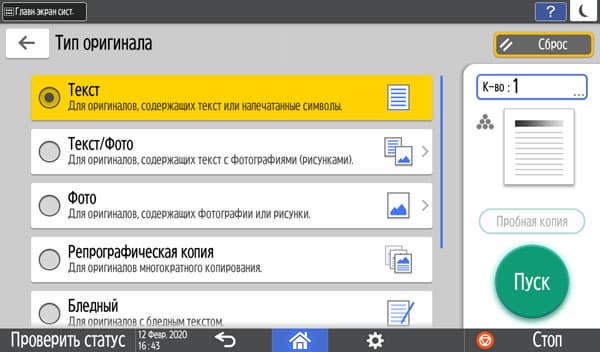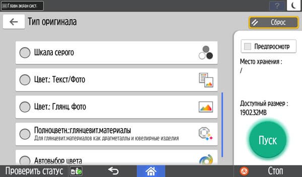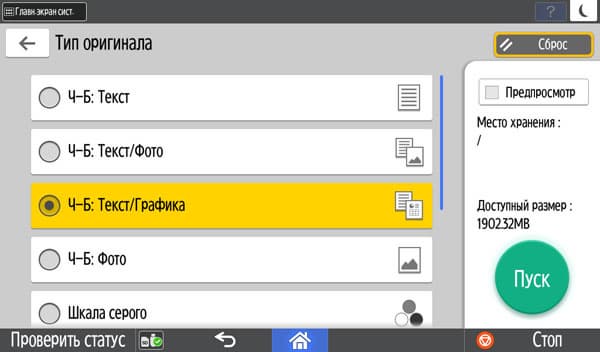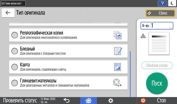 Кнопки дополнительных настроек позволят подстроиться под конкретный оригинал — например, поменять плотность копии, выбрать один из семи типов (кроме привычных «текст — фото — текст/фото» есть и более специфические, вроде копирования карт или оригиналов с бледным изображением).
