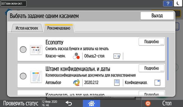 Однако удобства для пользователя все же предусмотрены — есть персонализация, которая доступна для экрана не только функции копирования. Вызывается эта процедура нажатием символа шестеренки в нижней дополнительной строке, в появившемся списке следует выбрать «Настройки экрана». После этого можно выбрать второй стандартный вариант с бо́льшим количеством кнопок меньшего размера, которые уже не требуют прокрутки; он называется «полный вид» в отличие от исходного «обычного вида».