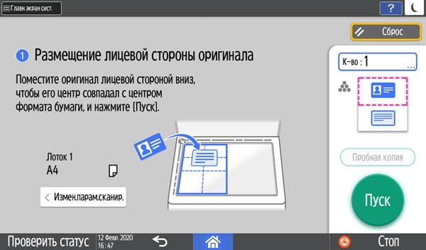 Когда установлен этот режим копирования, меняется и вид кнопки запуска: вместо зеленого круга «Пуск» появляется синий пятиугольник-стрелка «Копир.удост.личн. — Далее». Нажатие на него вызывает последовательность шагов с подробными экранными инструкциями.