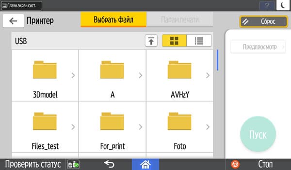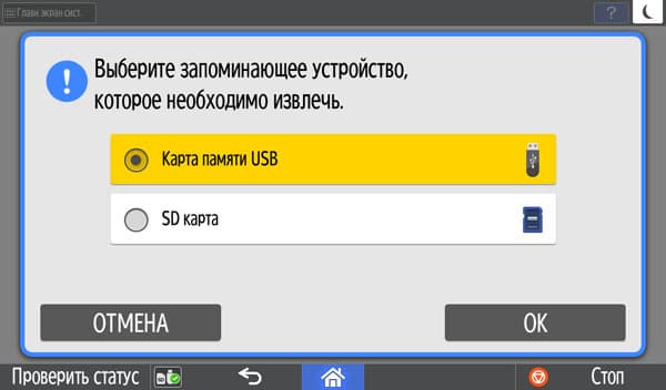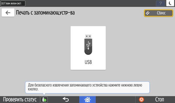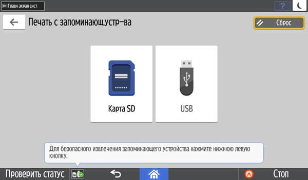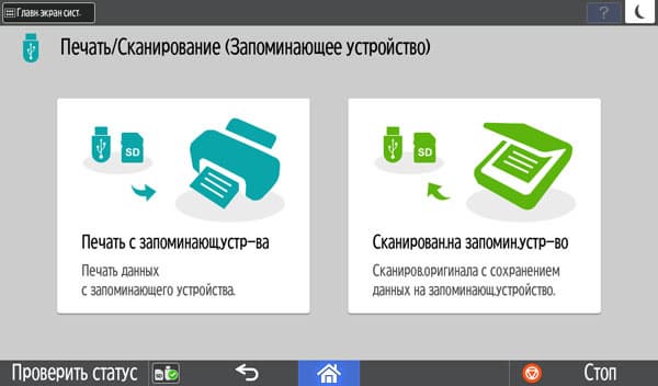МФУ может работать с USB-флешками и SD-картами. Но, конечно, не с любыми — есть ограничения: их емкость не должна превышать 32 ГБ, файловая система FAT16 или FAT32. Поддерживаются карты SD и SDHC, но не SDXC; не предусмотрена работа с внешними USB-концентраторами и картоводами, использование удлинителей, а также иных (кроме флешек) устройств с интерфейсом USB.