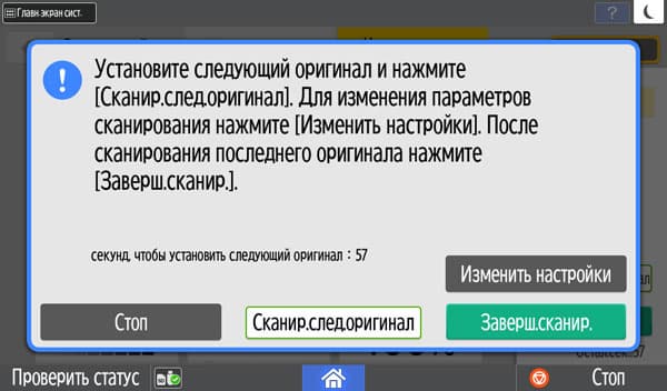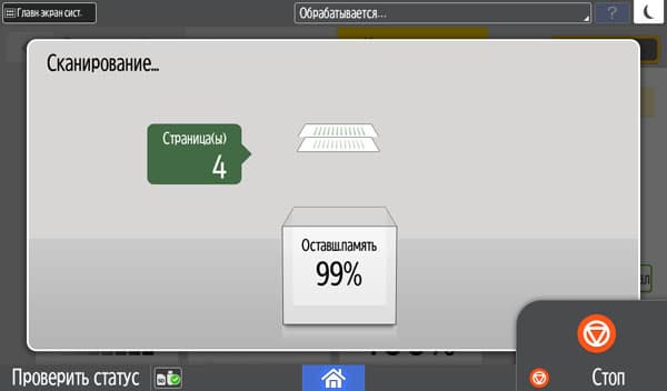 При этом для удобства контроля на ЖК-экране отображается количество отсканированных страниц (или сторон) оригиналов, а также процент свободной памяти, о чем упоминалось выше.