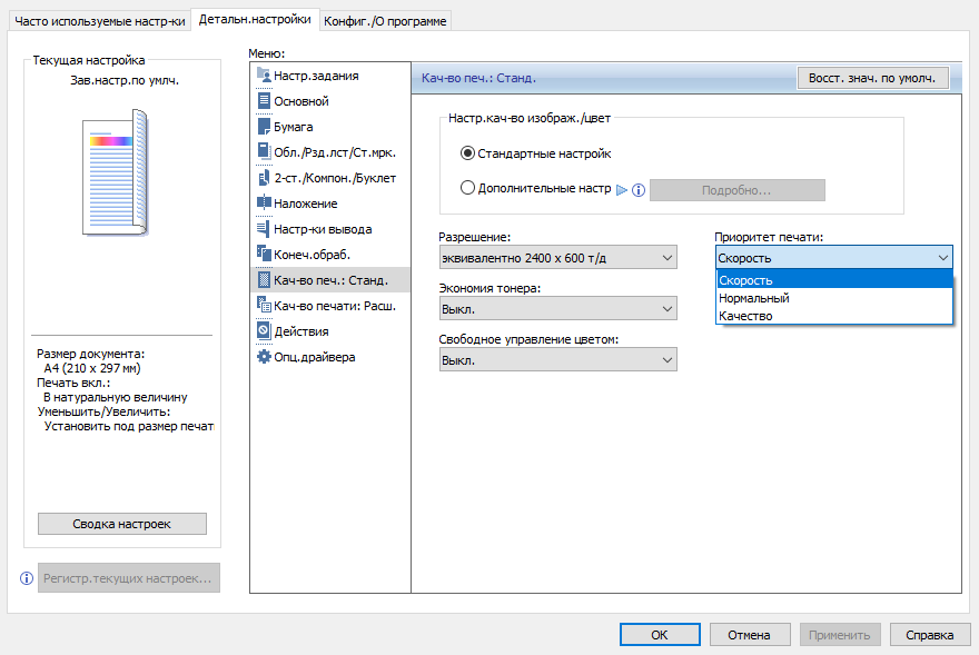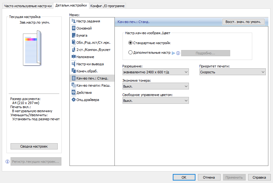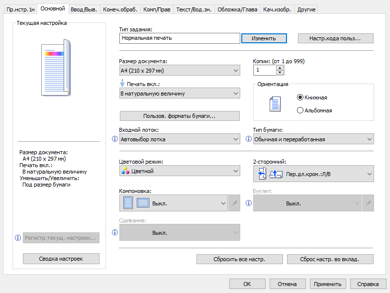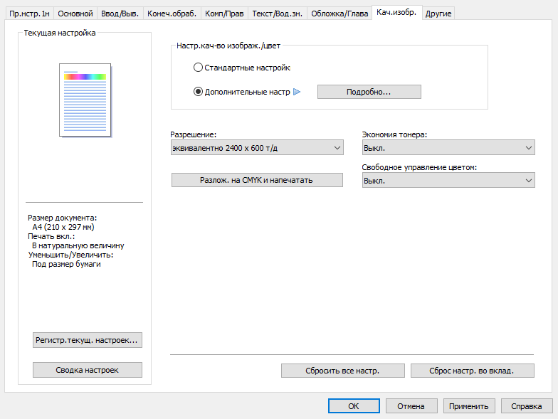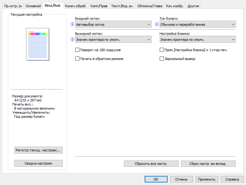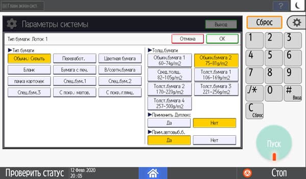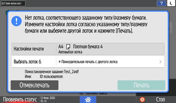 Обычно мы опробуем работу с бумагой, плотность которой немного превосходит заявленную. В данном случае заявленный предел по плотности очень велик — найти бумагу даже с плотностью 300 г/м² непросто, и у нас на момент тестирования была лишь бумага 280 г/м². Проверка показала: с любого лотка она подается нормально, фиксация тонера при выборе соответствующей установки в драйвере «Плотная 4 (257—300 г/м2)» хорошая, но скорость печати при этом существенно уменьшается. Естественно, в настройках лотка также следует указать соответствующий носитель (только название там немного иное — «Толст.бумага 4 257—300g/m2»), иначе МФУ выдаст сигнал об ошибке.