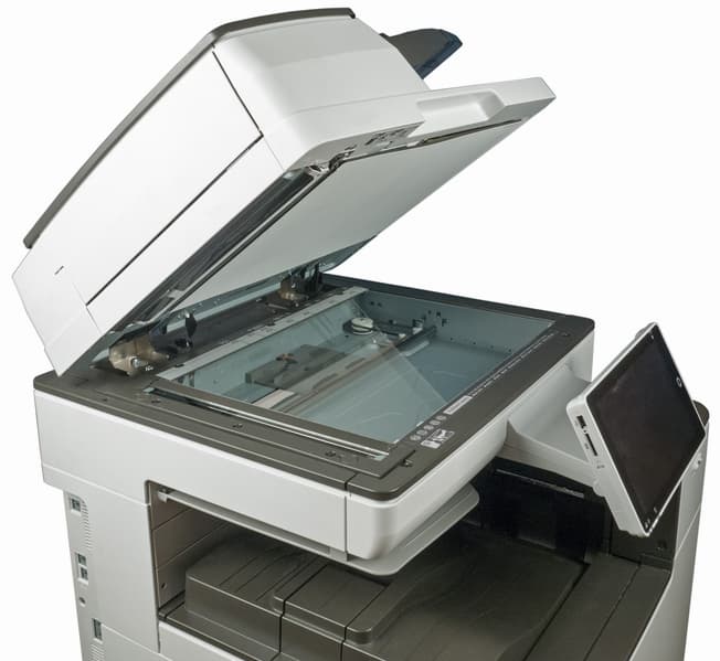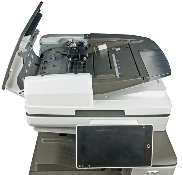 Как уже сказано выше, в нашем аппарате был установлен однопроходный автоподатчик документов, то есть обработка обеих сторон документа происходит одновременно. Для работы со стекла АПД можно открывать на угол до 90 градусов, причем с возможностью фиксации и в других положениях, начиная примерно с 20-25 градусов.