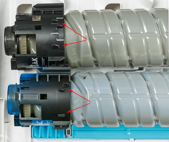 Они оснащены выступами-ключами, набор которых индивидуален для каждого цвета, то есть перепутать картриджи при установке нельзя.