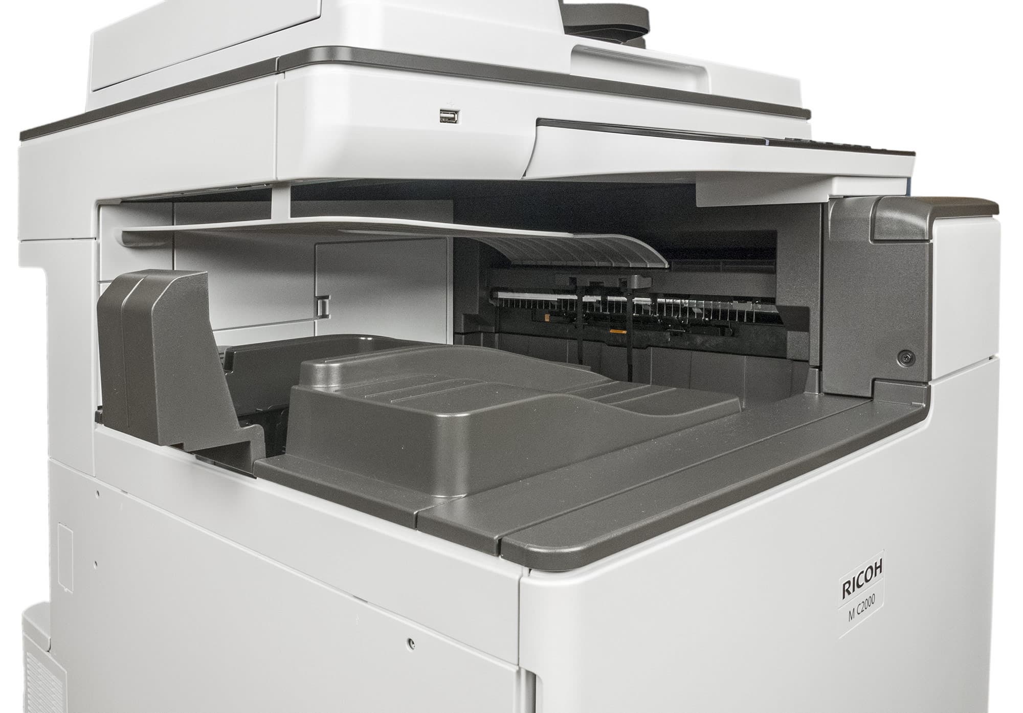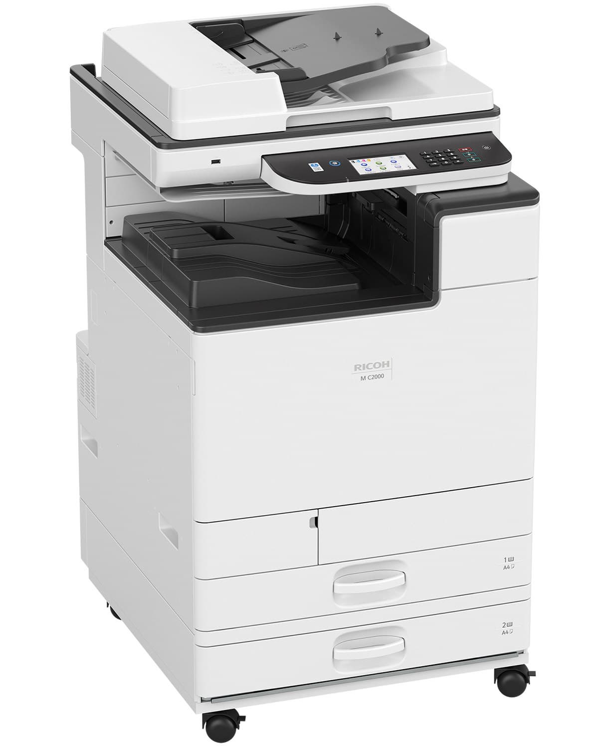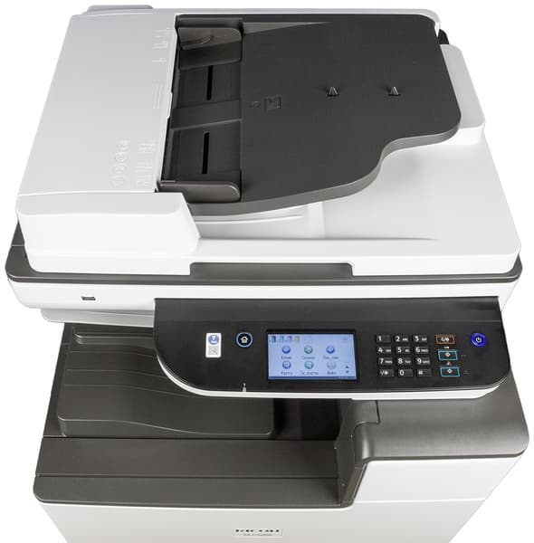 Аппарат Ricoh M C2000 в базовой поставке оснащен дуплексом — устройством автоматической двусторонней печати, реверсивным автоподатчиком документов и небольшим (по сравнению с имеющимся в IM C2000) цветным сенсорным ЖК-экраном, имеет два подающих лотка: выдвижной и обходной, а также два интерфейса: локальный USB и сетевой Ethernet. Для работы в беспроводной сети можно приобрести опциональный адаптер Wi-Fi. Предусмотрена возможность сохранения сканов на USB-флешку, разъем для которой расположен в передней части аппарата.