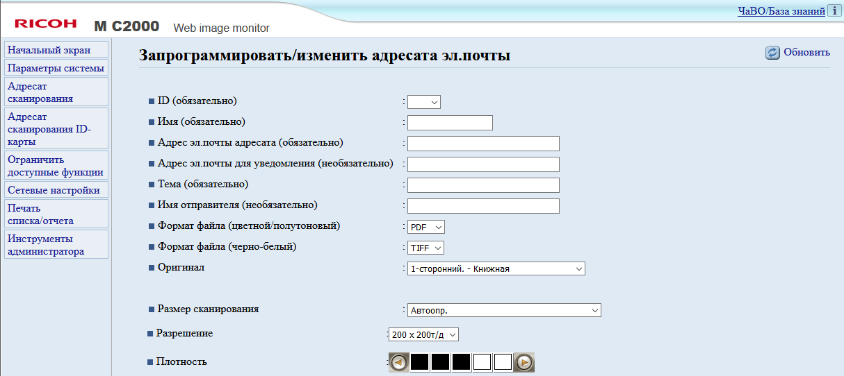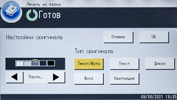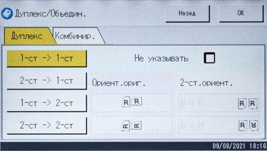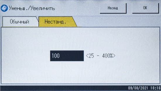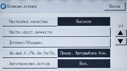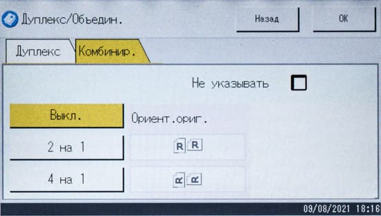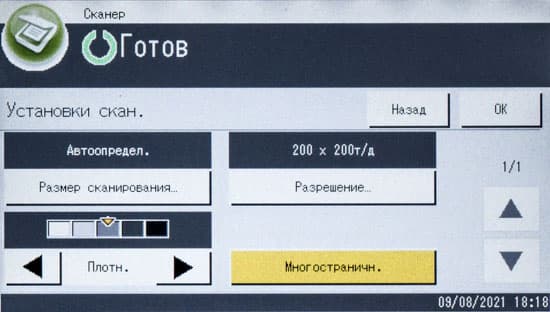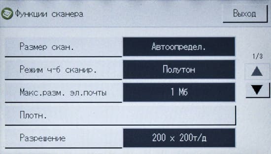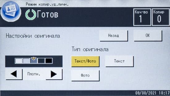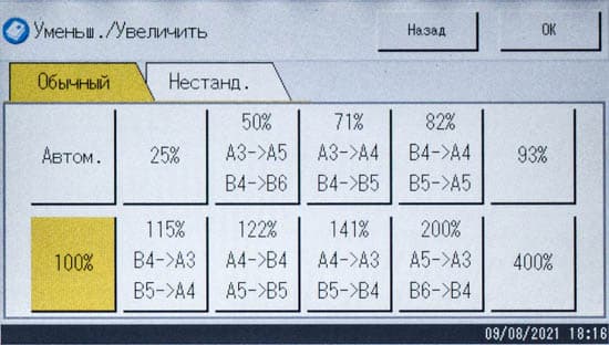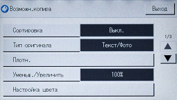 Можно изменить плотность изображения (пять ступеней), определить масштабирование (ступенчато — например, оригинал А3 в копию А4, либо заданием коэффициента вручную от 25 до 400 процентов с шагом в 1%). Кроме того, задается количество сторон на оригинале и копии, есть и функция объединения, когда на одну страницу копии выводятся два или четыре оригинала с соответствующим уменьшением.