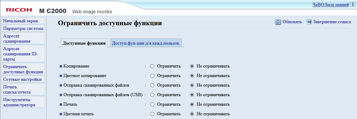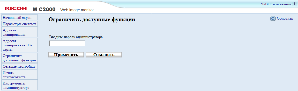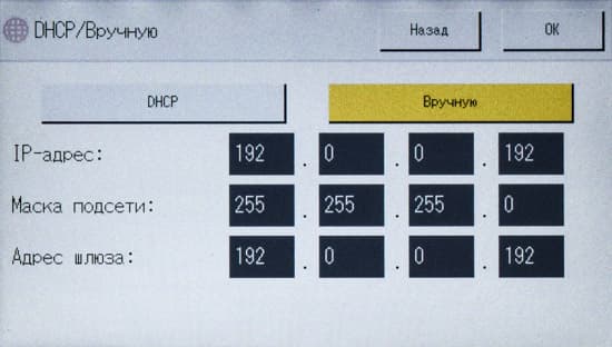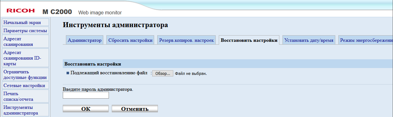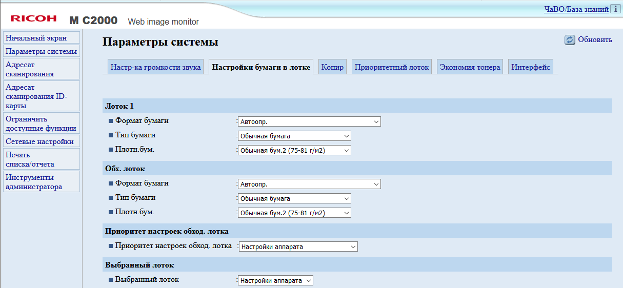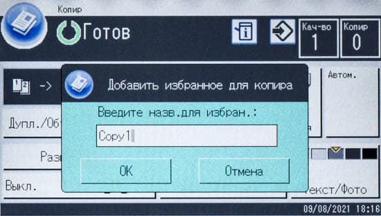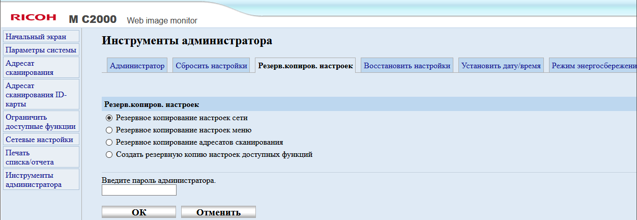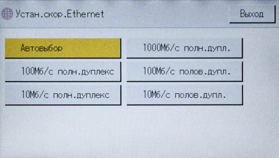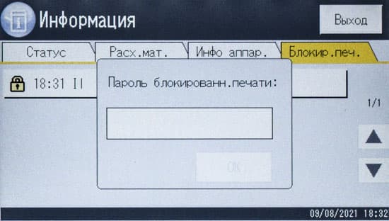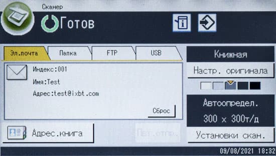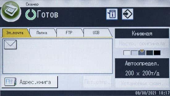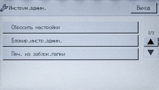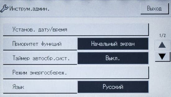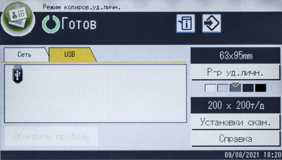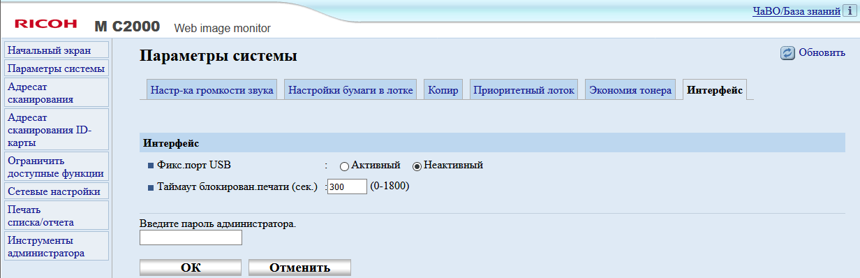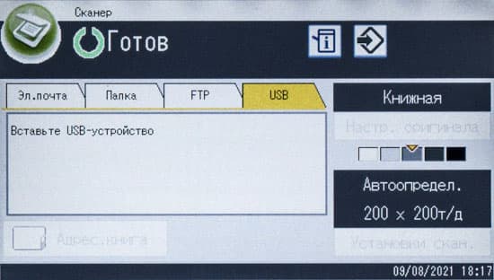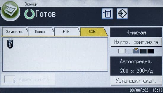 После включения МФУ или автосброса по таймеру не обязательно будет отображаться начальный экран, можно задать и экран копирования либо сканирования, если какая-то из этих функций используется чаще; выбор производится в инструментах администратора, там же можно задать админский пароль из четырех цифр, тогда в этом разделе настроек появятся две дополнительные функции: «IPSec» и «Сохр.скан.дан.на USB».