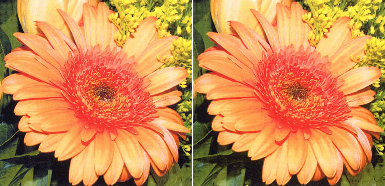 С настройками по умолчанию детали в тенях передаются хорошо, в светах похуже — например, не совсем корректно передается фактура поверхности, на которой находятся женщина и собака. Телесные цвета в целом отображаются нормально, хотя при сравнении с оригиналом разница будет заметной; на фото с мальчиком можно заметить и тонкую поперечную полосу с повышенной яркостью, такое хоть и редко, но появляется на отпечатках и копиях.
