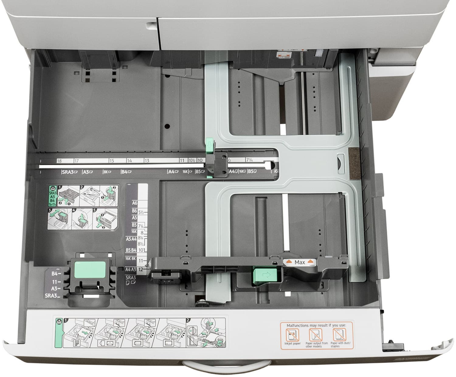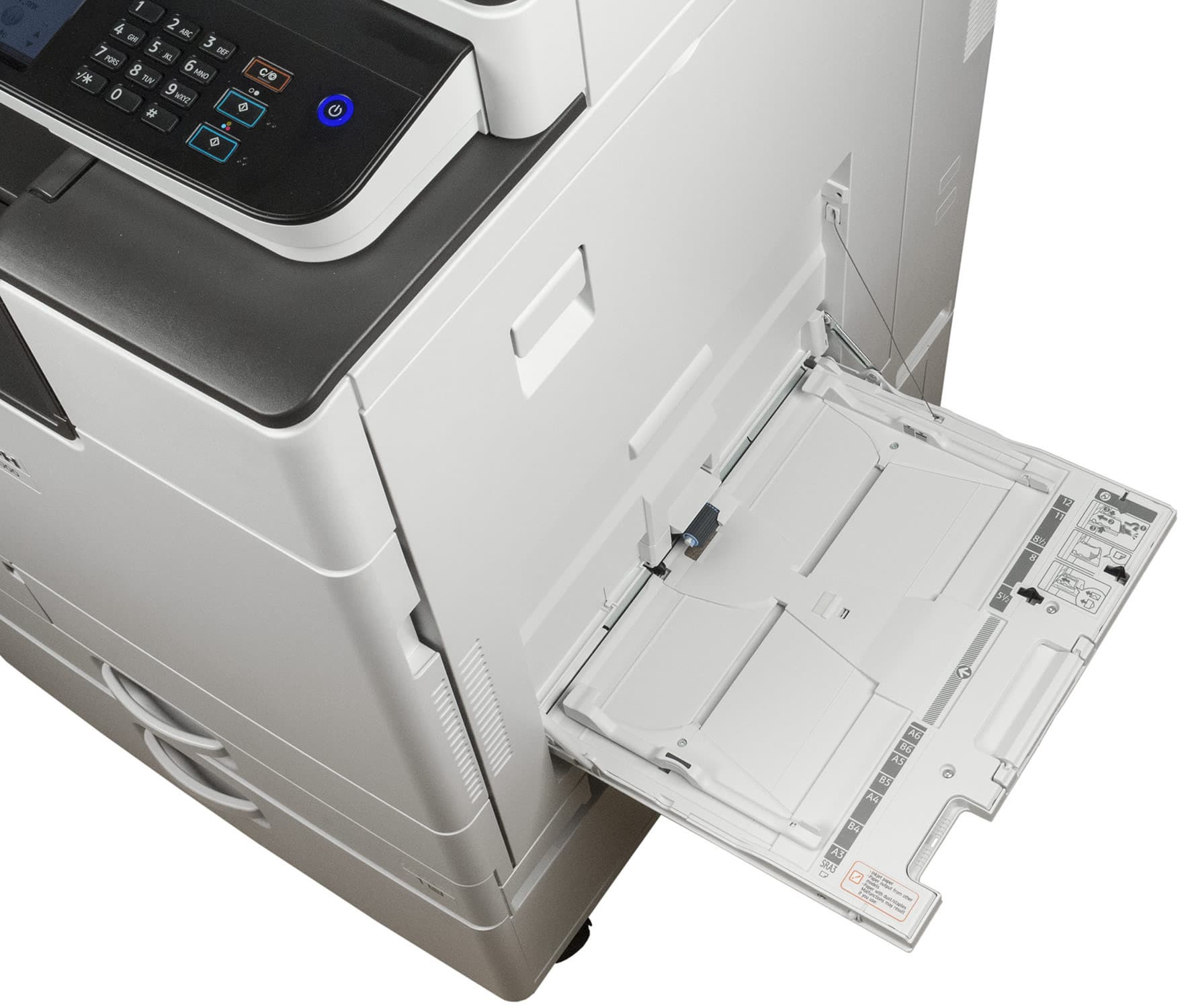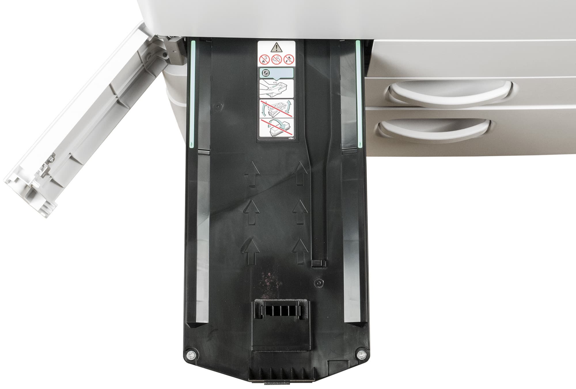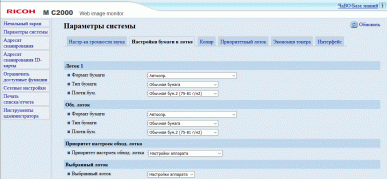 Штатных подающих лотков два. Выдвижной находится в нижней части базового блока и вмещает 550 листов, то есть в него можно положить полную пачку бумаги, даже если ее плотность несколько выше обычных 80 г/м². Доводчика, плавно и тихо втягивающего лоток на место после легкого толчка, в данной модели нет (а в более дорогих «интеллектуальных» имеется); тем не менее, даже полностью загруженный бумагой А3 лоток ходит очень легко и закрывается без громкого стука (если, конечно, не делать это пинком), в отличие от подобных лотков во многих недорогих МФУ — в Ricoh M C2000 этому способствует наличие микролифта, приподнимающего передний край стопки бумаги в лотке. К сожалению, при выдвижении лотка стук все же есть.