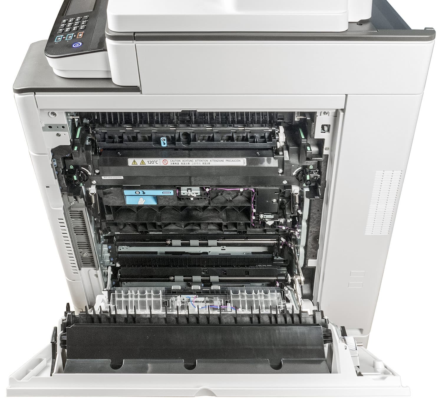Ниже приемного лотка на передней плоскости МФУ есть откидная крышка, за которой находятся многие заменяемые узлы и компоненты, в том числе тонер-картриджи.