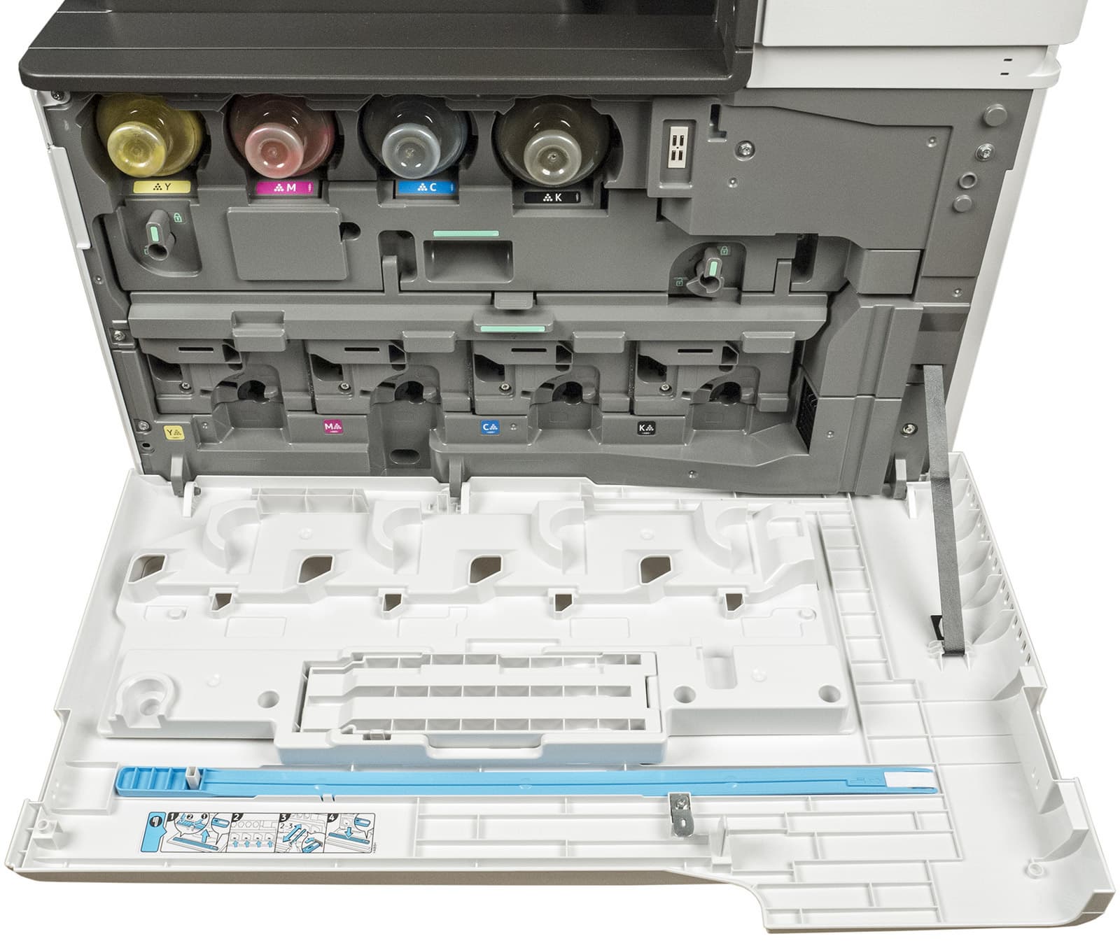 Над выдвижным лотком слева расположен люк, закрывающий место установки контейнера для отработанного тонера.