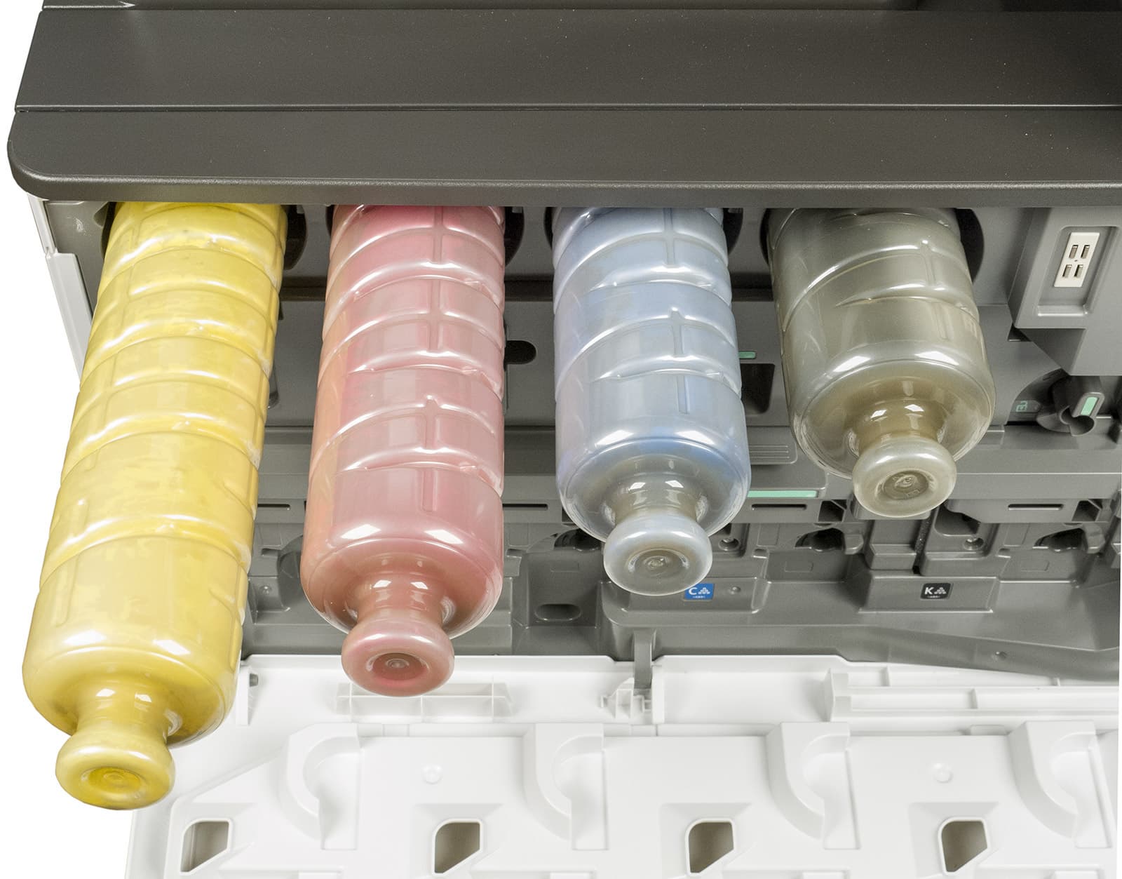 Кроме того, есть совмещенные блоки фотобарабана и проявки — черный и цветные (отдельно для каждого из цветов CMY):