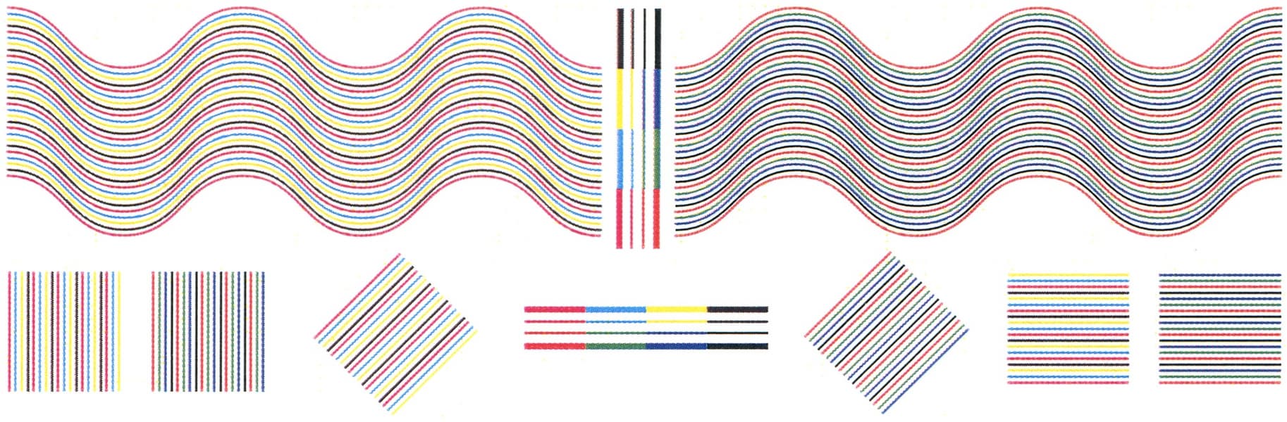 Совмещение красок по горизонтали очень хорошее, по вертикали чуть хуже, тонкие линии воспроизводятся хорошо, без заметных даже при увеличении разрывов и ступенек, на изогнутых линиях нет перетеканий и ступенчатой структуры.