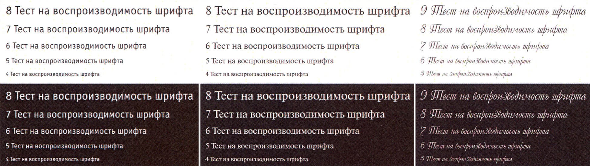 На текстовых полях при печати нормальной и вывороткой шрифты с засечками и без читаются от 4-го кегля, декоративный шрифт реально читается с кеглем от 6-го нормальный и от 7-го вывороткой.