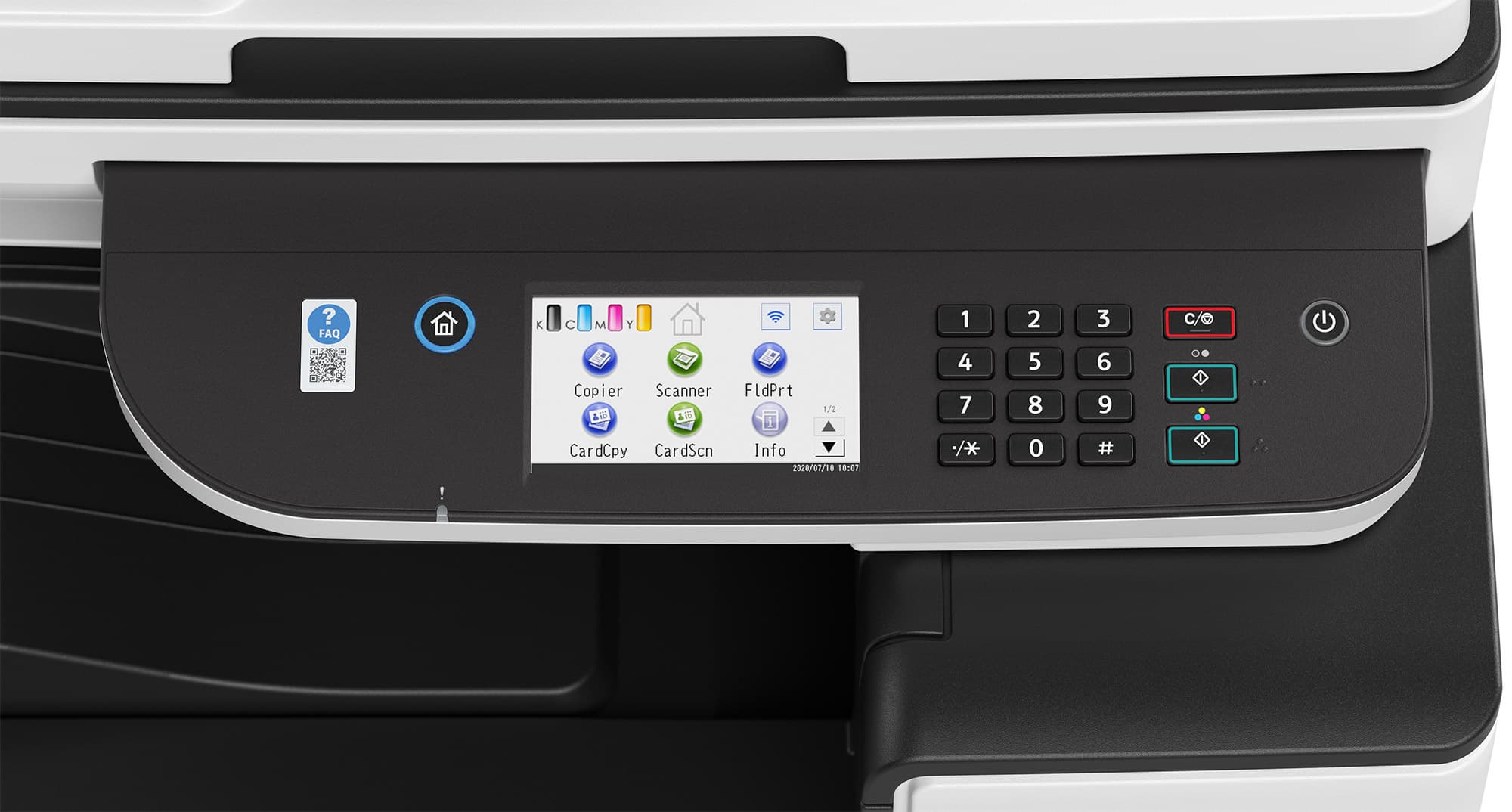 ЖК-экран с диагональю 4,3″ (10,9 см) занимает центральную часть панели, справа от него расположен 12-кнопочный цифровой блок, еще правее — раздельные для цветного и черно-белого режимов кнопки запуска копирования или сканирования, а также кнопка «Сброс/Стоп». В правом дальнем углу находится кнопка Power со встроенной подсветкой.
