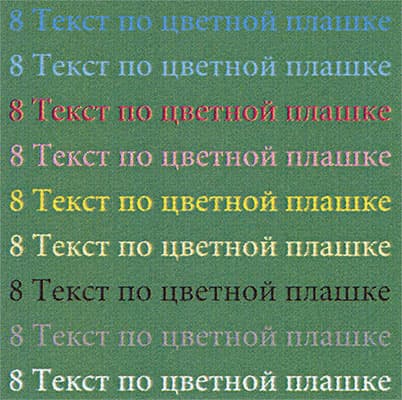 Цветной текст на зеленой плашке выглядит очень неплохо, включая даже синий шрифт, который обычно бывает различимым хуже других.