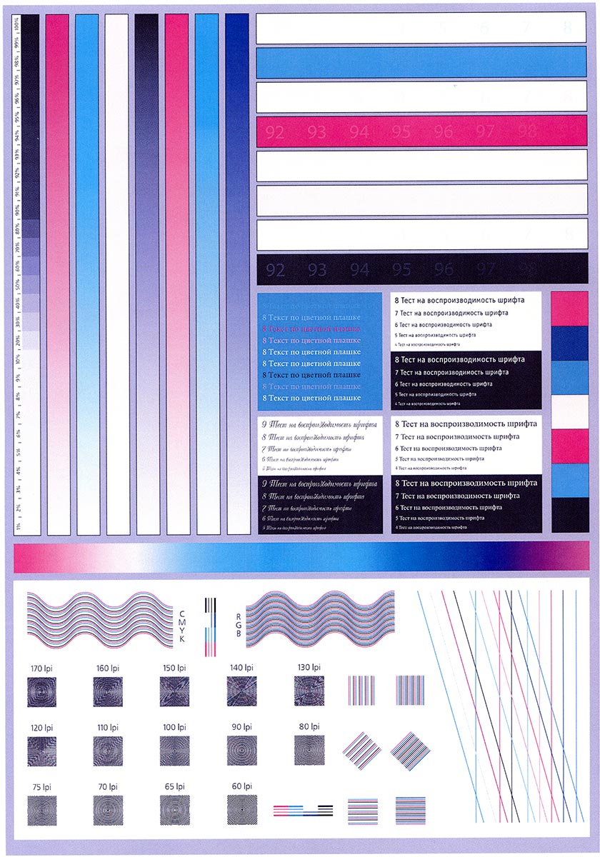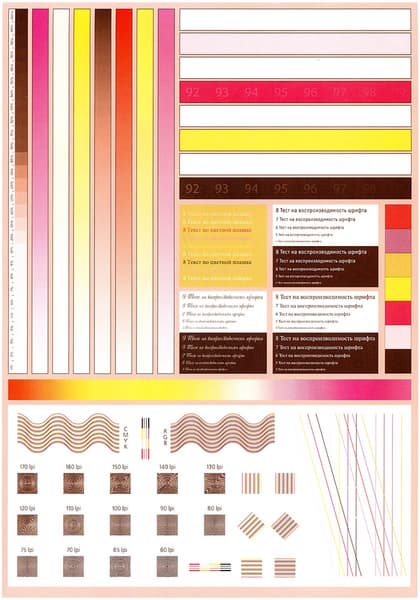 На копиях, сделанных с отпечатка, на котором отчетливо читаются шрифты 2-го кегля, при установке высокого качества этот кегль для шрифтов без засечек можно назвать условно читаемым, с засечками он все же не читается. Зато 4-й кегль хорошо различим с любым шрифтом. Плотность заливки великовата, но это можно поправить имеющимися регулировками.