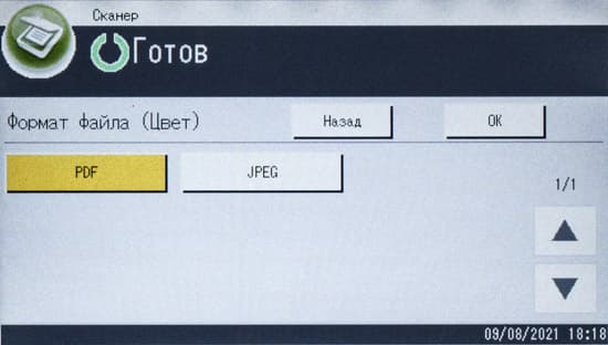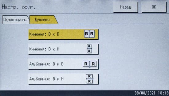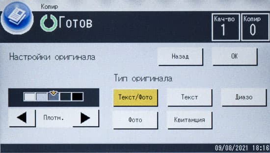 Выбор параметров здесь более узкий, чем для обычного копирования: типов документа три вместо пяти (без непонятных «Квитанции» и «Диазо»), нет масштабирования и двустороннего режима — сделать, например, копию четырех разворотов паспорта на одном листе в автоматическом режиме не получится.