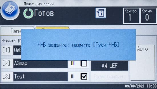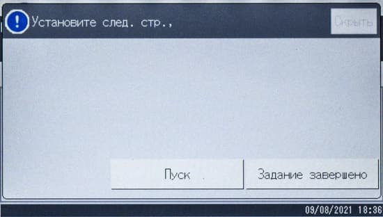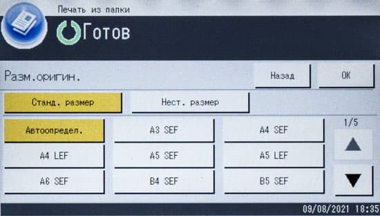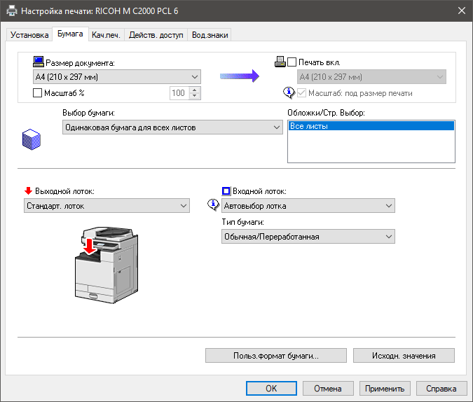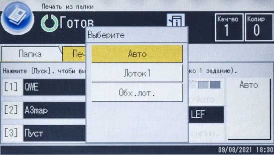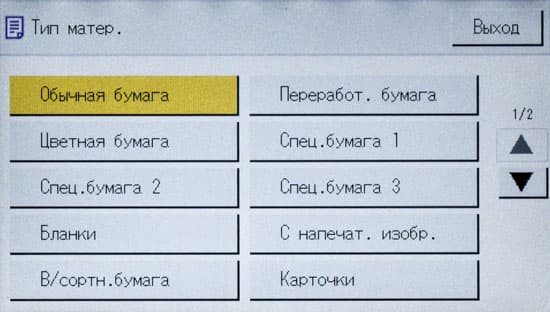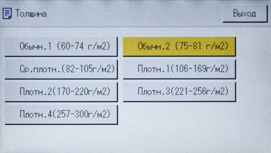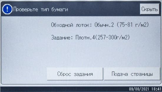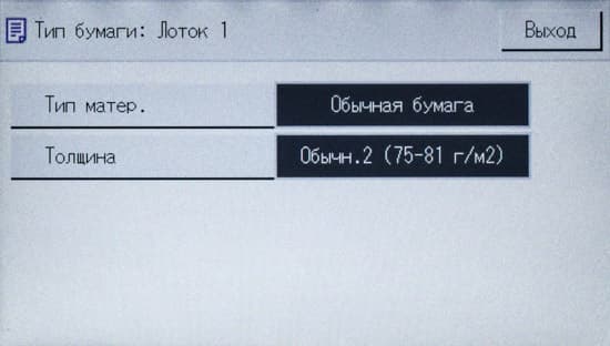 Обычно мы опробуем работу с бумагой, плотность которой немного превосходит заявленную. В данном случае заявленный предел по плотности очень велик — найти бумагу даже с плотностью 300 г/м² непросто, и у нас на момент тестирования была лишь бумага 280 г/м². Проверка показала: с любого лотка она подается нормально, фиксация тонера при выборе соответствующей установки в драйвере «Плотная 4 (257-300 г/м2)» хорошая, но скорость печати при этом существенно уменьшается. В настройках лотка следует указать такой же носитель, иначе МФУ выдаст предупреждение о несоответствии, в котором есть два варианта: сбросить задание либо все же подавать бумагу.