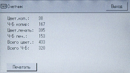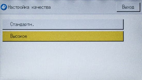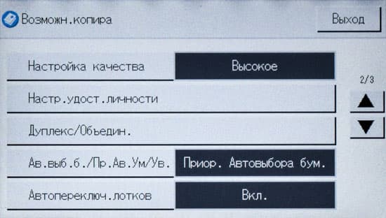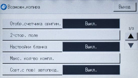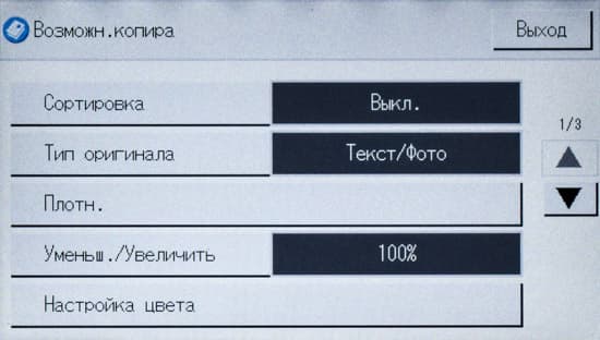 Кроме этого, есть некоторые дополнительные установки, которые находятся в меню настроек (доступ по нажатию иконки с шестеренкой на начальном экране), раздел «Возможн.копира». Помимо изменения умолчаний, там есть и пункты, некоторые из которых, по нашему мнению, было бы лучше поместить на экране управления копированием: качество — стандартное и высокое, а также дополнительные настройки цвета (яркость для каждого из трех цветов).