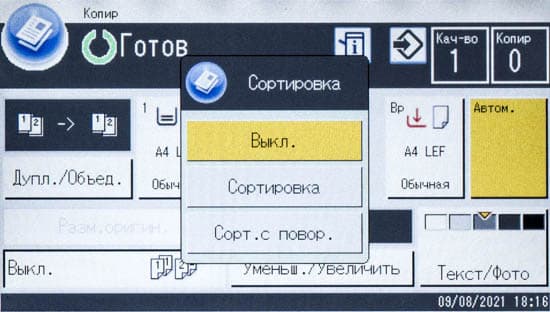 Возможна и сортировка, не только в смысле «1,1,2,2,3,3» или «1,2,3,1,2,3», но и разделение комплектов поворотом на 90 градусов — конечно, физического поворота не происходит, просто требуется наличие бумаги с разной ориентацией (подача короткой/длинной кромкой, английские аббревиатуры SEF/LEF) в двух лотках, штатные тоже могут быть использованы для этой цели. Время выполнения задания при этом увеличивается, но не слишком значительно.