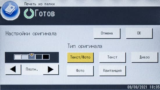 Тип документа выбирается из пяти вариантов, среди которых, кроме вполне обычных «Фото», «Текст» и «Текст/Фото», есть два, которые доступны только при работе со стекла, но не очень понятны: «Квитанция» (в инструкции «Докум.»), который рекомендуется выбирать «при копировании ваучера» (у россиян постарше это слово вызывает не самые приятные воспоминания), и совсем уж таинственный «Диазо» — инструкция определяет его как «изготовление светокопии оригинала», но понятнее не становится. Мы попробовали оба эти типа для тестового листа и оригинала с фотоизображениями, но сколь-нибудь заметных отличий от «Текст/Фото» или «Фото» не обнаружили.