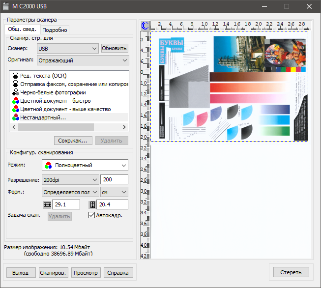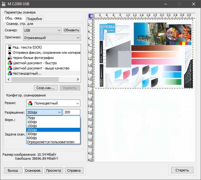Для работы с USB-флешкой задавалось сохранение в виде многостраничного PDF-файла, время замерялось от нажатия кнопки «ОК» на экране выбора формата (именно она запускает сканирование) до окончания записи файла, при сканировании с компьютера — от старта кнопкой приложения до появления последней страницы в его окне (установки в драйвере TWAIN по умолчанию, кроме отмеченных в таблице).