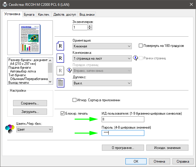 Надо отметить, что если в драйвере выбрать установку с плотностью 170 г/м² и выше («Плотная 2, 3, 4»), то задать двустороннюю печать станет невозможно, и для бумаги 200 г/м² мы задавали «Плотная 1 (106-169 г/м2)», при этом проблем с закреплением тонера не наблюдалось, однако с еще более плотной они возможны, даже если сам дуплекс отработает нормально.