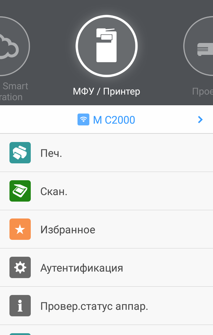 В верхней части начального экрана меню отображаются: слева — диаграммы остатков тонера по четырем цветам, справа — кнопка перехода к настройкам. При наличии опции Wi-Fi и включении беспроводной ЛВС появится дополнительный значок, нажатие на который откроет страницу соответствующих настроек.
