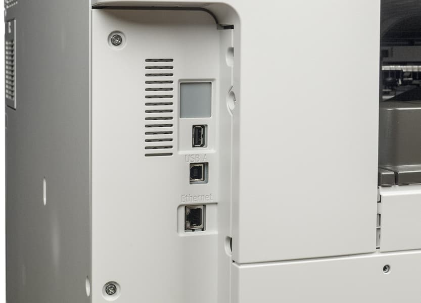 Интерфейсные разъемы находятся слева, ближе к задней стенке. Для них сделана ниша глубиной около 3,5 см, то есть подключенные кабели не будут заметно выступать за габариты аппарата. С портами USB-B и RJ-45 все понятно без комментариев, а имеющийся там же разъем USB-A предназначен для подключения не доставшегося нам опционального адаптера Wi-Fi (первый попавшийся USB-«свисток» не годится, нужен Ricoh IEEE 802.11 Interface Unit Type M47).
