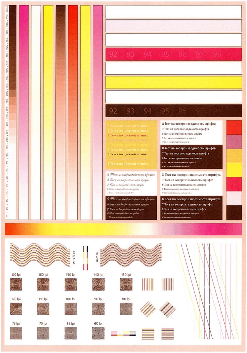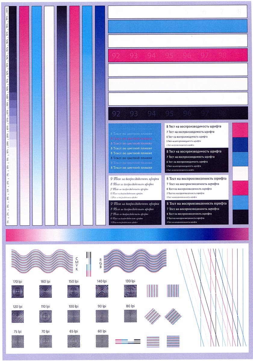 Явных ошибок в цветопередаче нет, плашки плотные, растр заметен лишь при увеличении. На градиентах неравномерность незначительная и без резких переходов.
