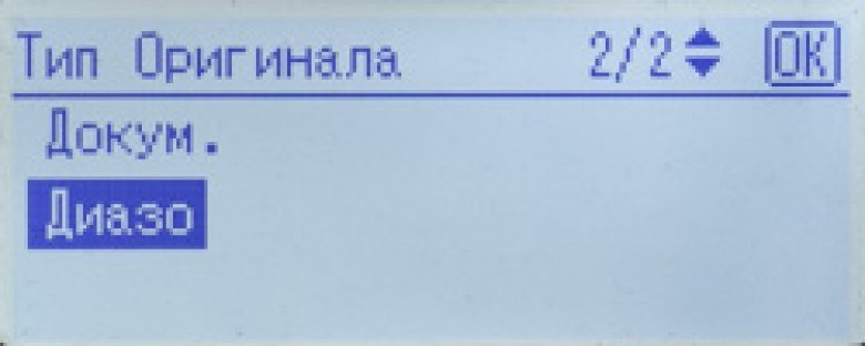 Меню не требует долгого освоения и тщательного изучения инструкции, к тому же язык можно выбирать из немалого списка, где есть и русский. К переводу особых претензий нет, но, как часто бывает, используемые сокращения русских слов явно оставляют желать лучшего. Иногда они лишь чудны́е, но понятые — «Плотнст», но порой о значении догадаться попросту невозможно: что, например, может означать тип оригинала «Диазо»? Правда, и на английском эта установка выглядит так же: «Diazo», что в переводе означает «диазотипный», но ясности это не вносит, равно как и пояснение в инструкции: «изготовление светокопии оригинала».